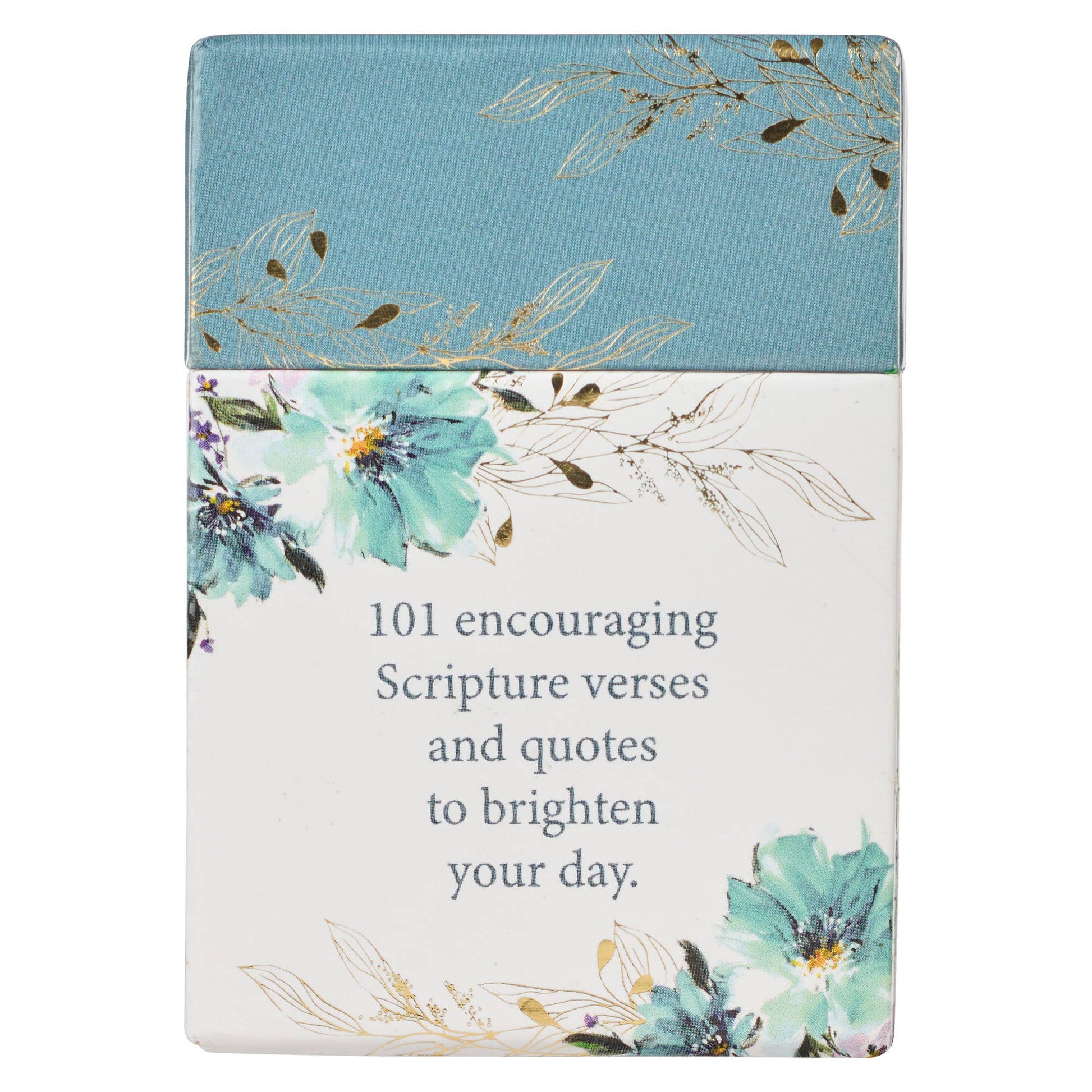 Full-color box with a teal floral design, Gold-foiled details and accents, Gold-foiled text, 50 double-sided cards50 double-sided cards, 50 quotes, 50 Scripture verses, Full-color print on the box, Full-color print on cards, Sturdy box with lid, Each box shrink-wrapped,
