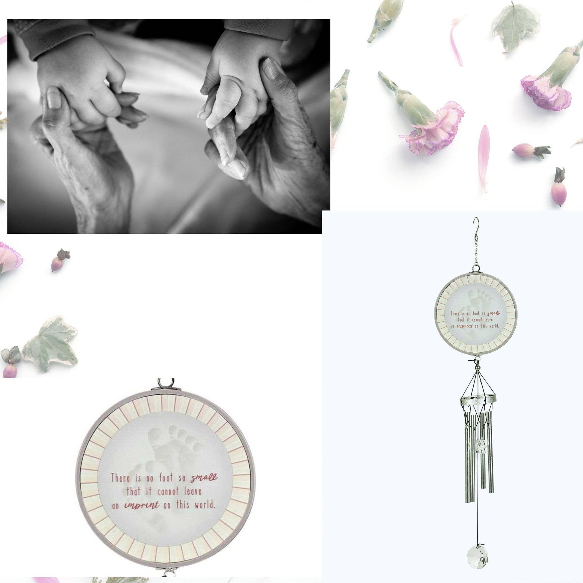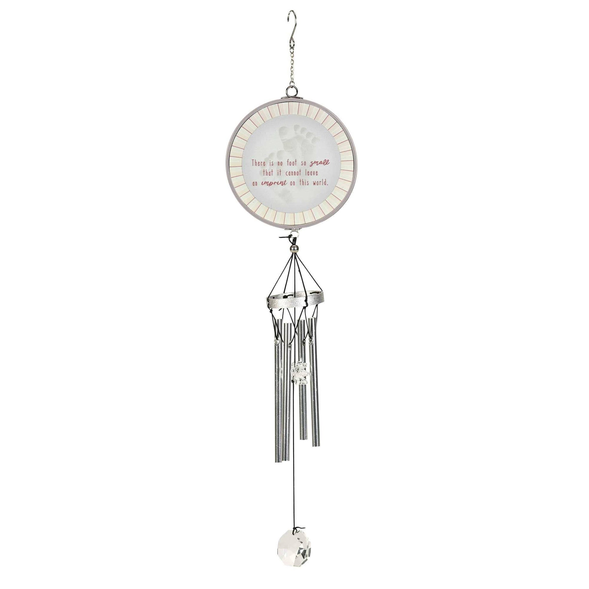 This sweet little wind chime is a thoughtful baby or small child bereavement gift. The 3 3/8 disc at top is also a suncatcher; displays a baby footprint design with the words There is no foot so small that it cannot leave an imprint on this world. Four small aluminum tubes tinkle lightly as they strike the clapper of three clear faceted glass beads. Sail beneath is a single large clear faceted glass bead. Length of entire chime from top to bottom is about 14 1/2.