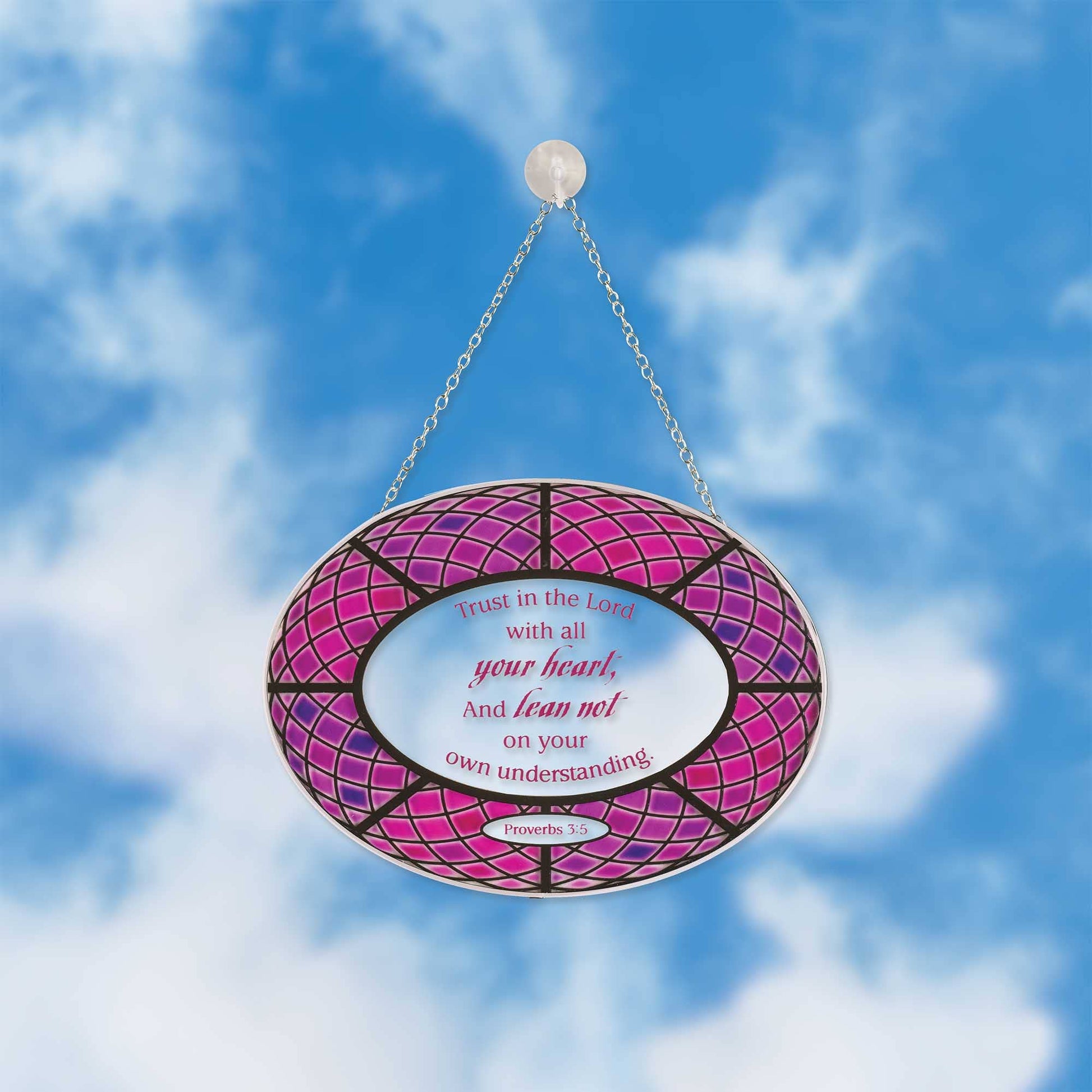 Welcome springtime with this oval shape suncatcher that shines with a colorful outline and Proverbs 3:5: Trust in the Lord with all your heart, and lean not on your own understanding. Size is 9 wide x 6 high. Finished with silver tone metal frame and hanging chain; clear suction cup included. Comes in a window box, all ready for gift giving.