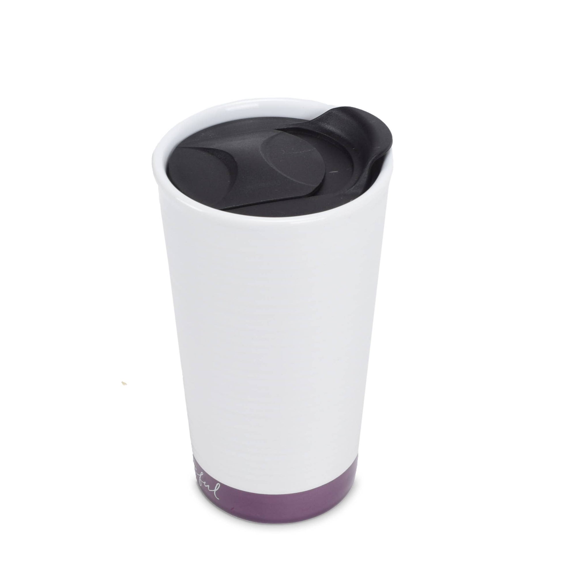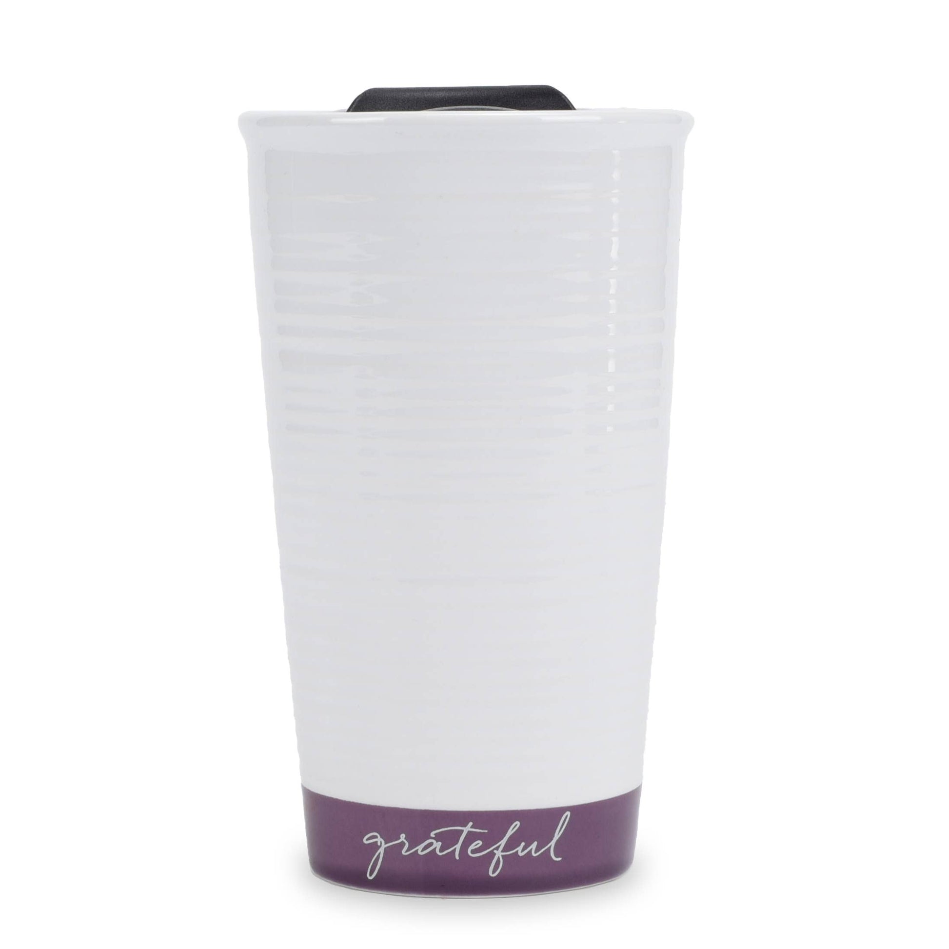 Travel coffee mug is textured with a ribbed pattern and finished in a classic white; Dipped bottom has an encouraging, yet simple message; Designed by Lighthouse Christian Products Features a sentiment that reads "Grateful" in a cursive, handwritten font Made of double-walled ceramic to keep your hot drinks hot and cold drinks cold; Lid is BPA free plastic with slide closure and small handle for easy removal Holds approximately 12 ounces of your favorite hot or cold beverage when you're on the go; Microwave and top rack dishwasher safe Lighthouse Christian Products partners with A Better Life for Kids to provide nutritious food, clean water, safe housing, education opportunities and love for children and families in Ghana, Africa - Your purchase helps make this meaningful work possible