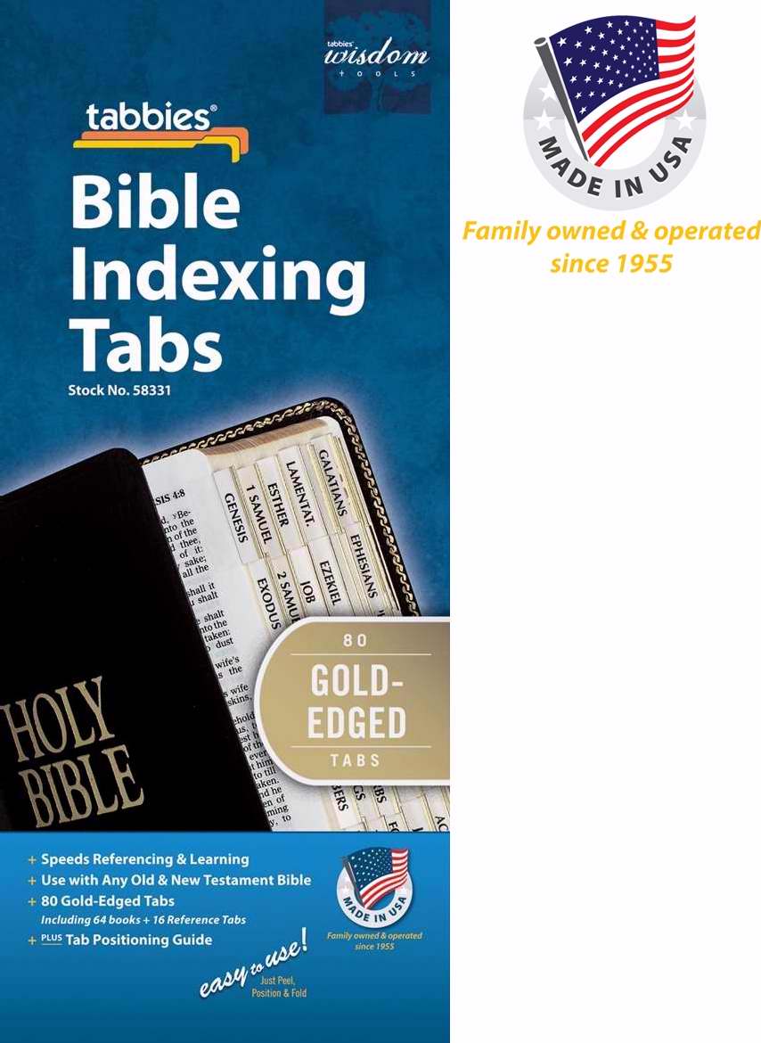 Bible readers have made Tabbies their long-time favorite indexing tabs---and with good reason. They're laminated to last through heavy use. They are flexible and grip both sides of the page to help prevent tearing. And most importantly, they make your Bible easier to reference! Bible book names are printed on both sides of each tab. Easy-to-read print complements Bibles and speeds referencing. Set includes application instructions.