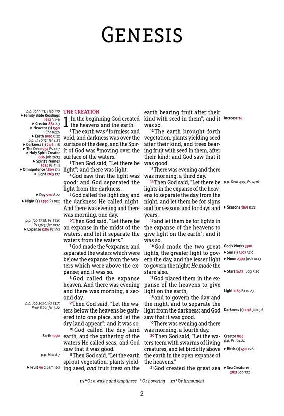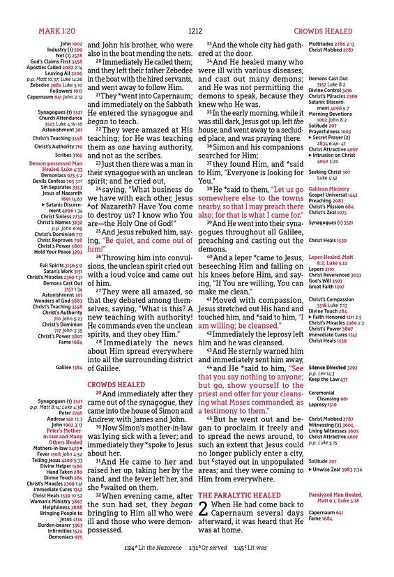 Scripture is presented with a reference system that acts as a guide, not merely a tool, allowing you to explore a specific topic methodically through the entirety of the text. Relevant scripture verses are linked together, with over 100,000 topical references and 8,000 chain topics, enabling a study of the Bible that is relevant for all of the faithful- from those interested in what the Bible says about a particular word of interest to those wanting to prepare a sermon that delivers the unity of God's special revelation to a divided world.