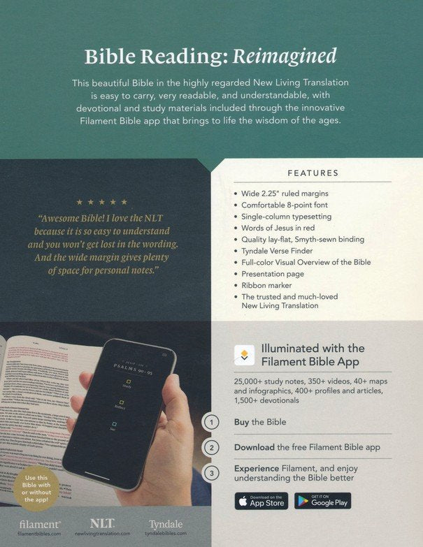 The Filament Bible app turns this Bible into a powerful study and devotional experience, enabling you to use your mobile phone or tablet to connect every page of this Bible to a vast array of related content, including study notes, devotionals, interactive maps, informative videos, and worship music. For no additional cost, purchase, size or weight, you will have access to a wealth of information and resources from the very page you are reading without cluttering up your Bible. Read the NLT Wide Margin Bible, Filament-Enabled Edition as a giant print Bible without the app for convenience or dive into all the free, easily accessible resources from your smartphone or tablet to explore God's Word for an enriching experience of His presence.