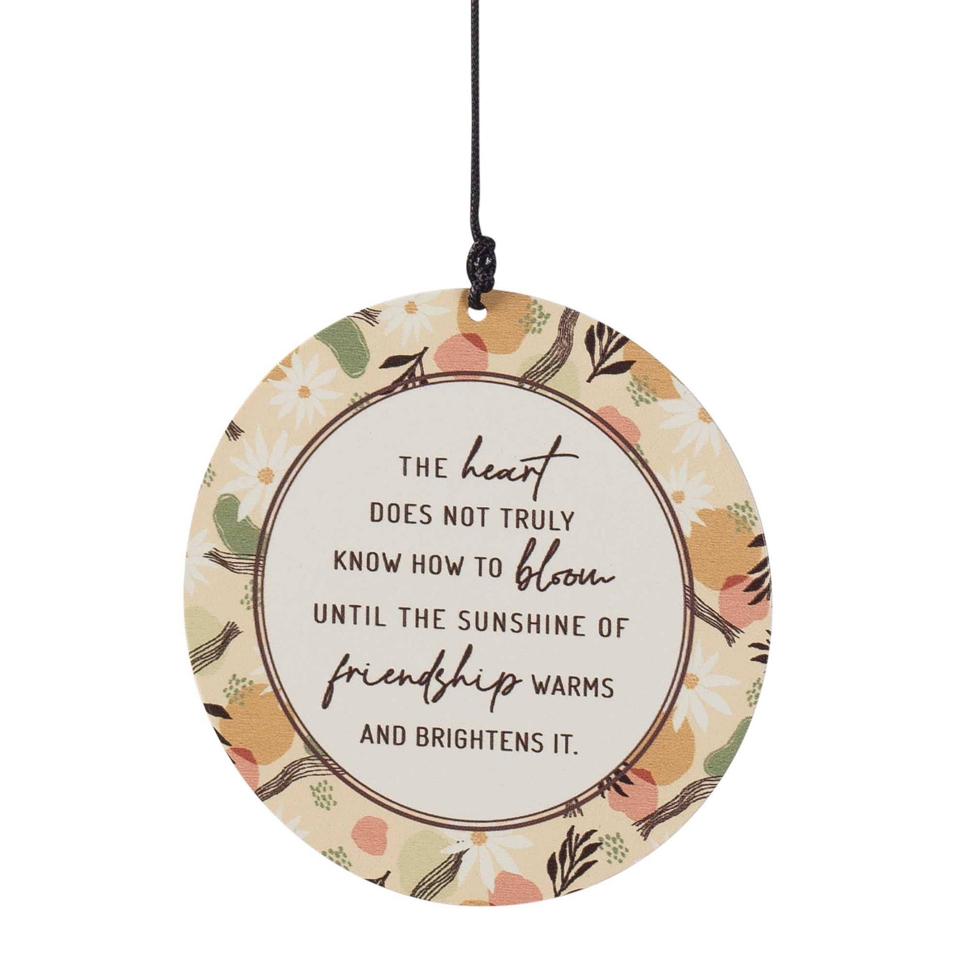 A lovely friendship gift is this wind chime with its light teal green aluminum tubes that also have a golden yellow floral design. The five tubes are varying lengths to produce a harmonious blend of notes. Beneath is a 3 3/8 metal sail decorated front and back with a floral border and these words: The heart does not truly know how to bloom until the sunshine of friendship warms and brightens it. Suspension platform and clapper are finished in a deep cherry wood tone. Total length of chime from top to bottom is about 35".