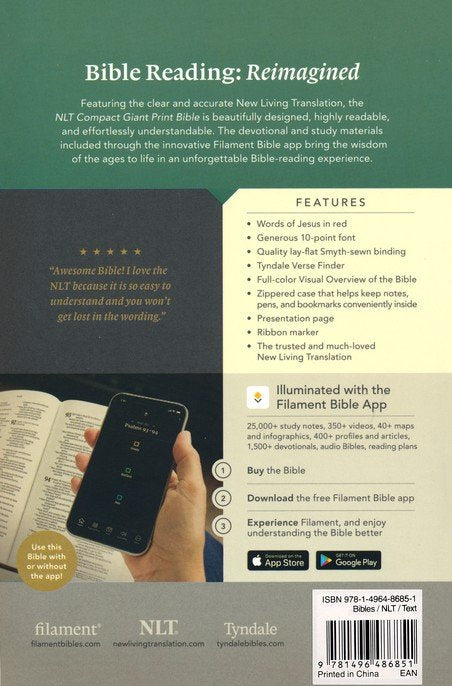The NLT Giant Print Compact Zipper Bible, Filament-Enabled Edition provides God's Word to you in a slim, easy-to-carry profile with a large print for comfortable reading - with added resources and benefits of the unique Filament Bible app.