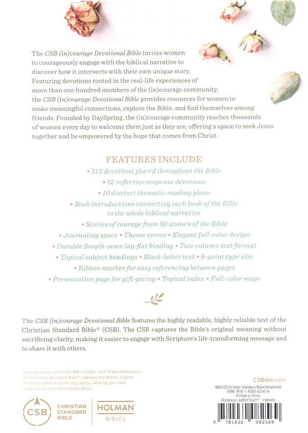 Where do you go for encouragement and inspiration when you need to connect? The CSB (in)courage Devotional Bible is a fresh oasis of spiritual refreshment for women! This unique devotional Bible combines the beauty and wisdom of God's Word with supportive devotional features. Explore "Stories of Courage"- stories of 50 women in the Bible; be inspired by 312 insightful devotions by 122 (in)courage community writers. Experience Scripture in new ways in the company of women willing to "go first" and share everyday stories that bear witness to God's grace!