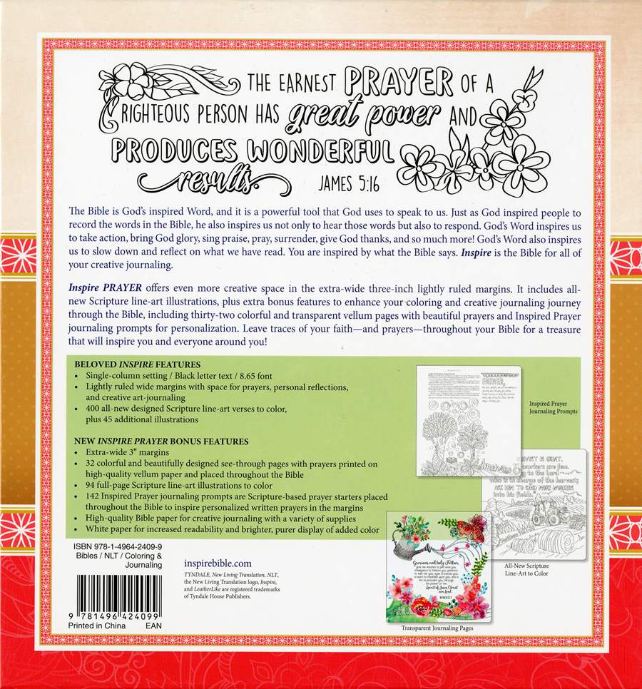 The Inspire PRAYER Bible has wider margins with even more space to Bible journal or create; 400 beautiful full- and partial-page Scripture line-art illustrations to color; 32 colorful and gorgeously designed see-through vellum pages featuring prayers; and 142 Inspired Prayer journaling prompts to inspire personalized prayer. All features in this special edition of Inspire are aimed at helping the reader focus their heart on prayer and enhancing their coloring and creative-journaling journey through the Bible.