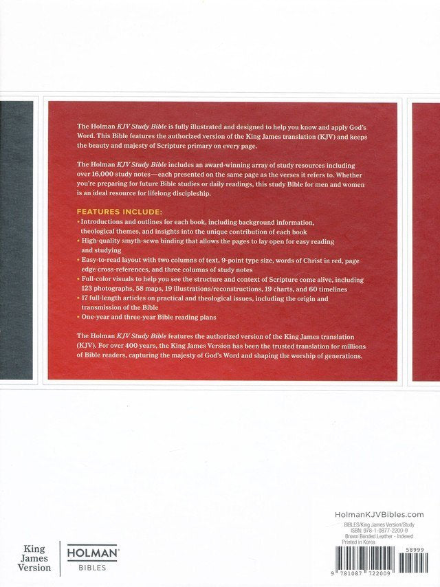 The Holman KJV Study Bible has been designed to guide you on your life-long journey of faith by providing over 16,000 study notes alongside God's Word. Illustrated with full-color visual aids that bring to life the people, settings, and places of Scripture, the Holman KJV Study Bible has an award-winning array of additional study resources that have been assembled to encourage daily reading by both men and women. Text is presented in the trusted and beloved King James Version translation.