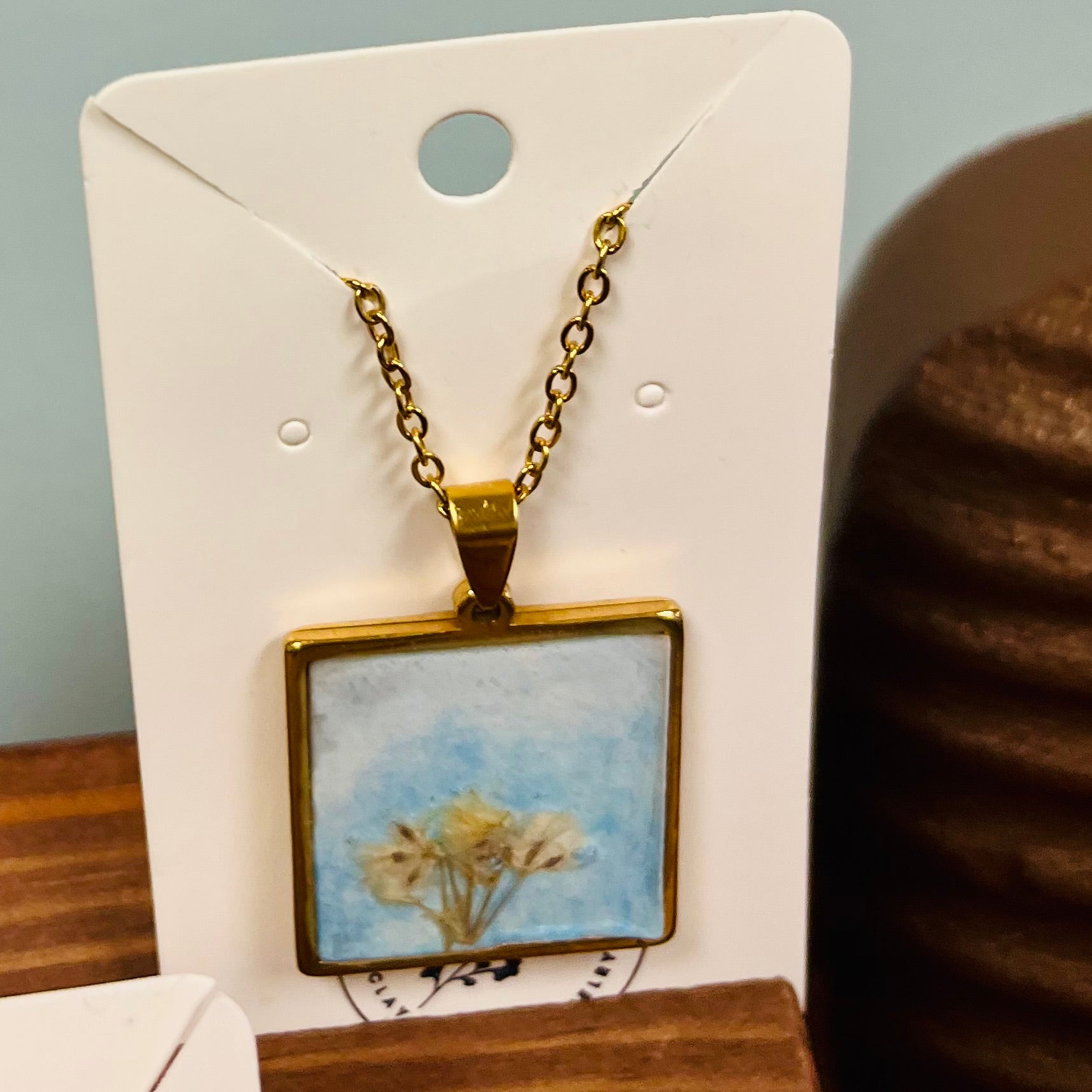 Gold Vintage Writing Brown and White pressed flowers necklace