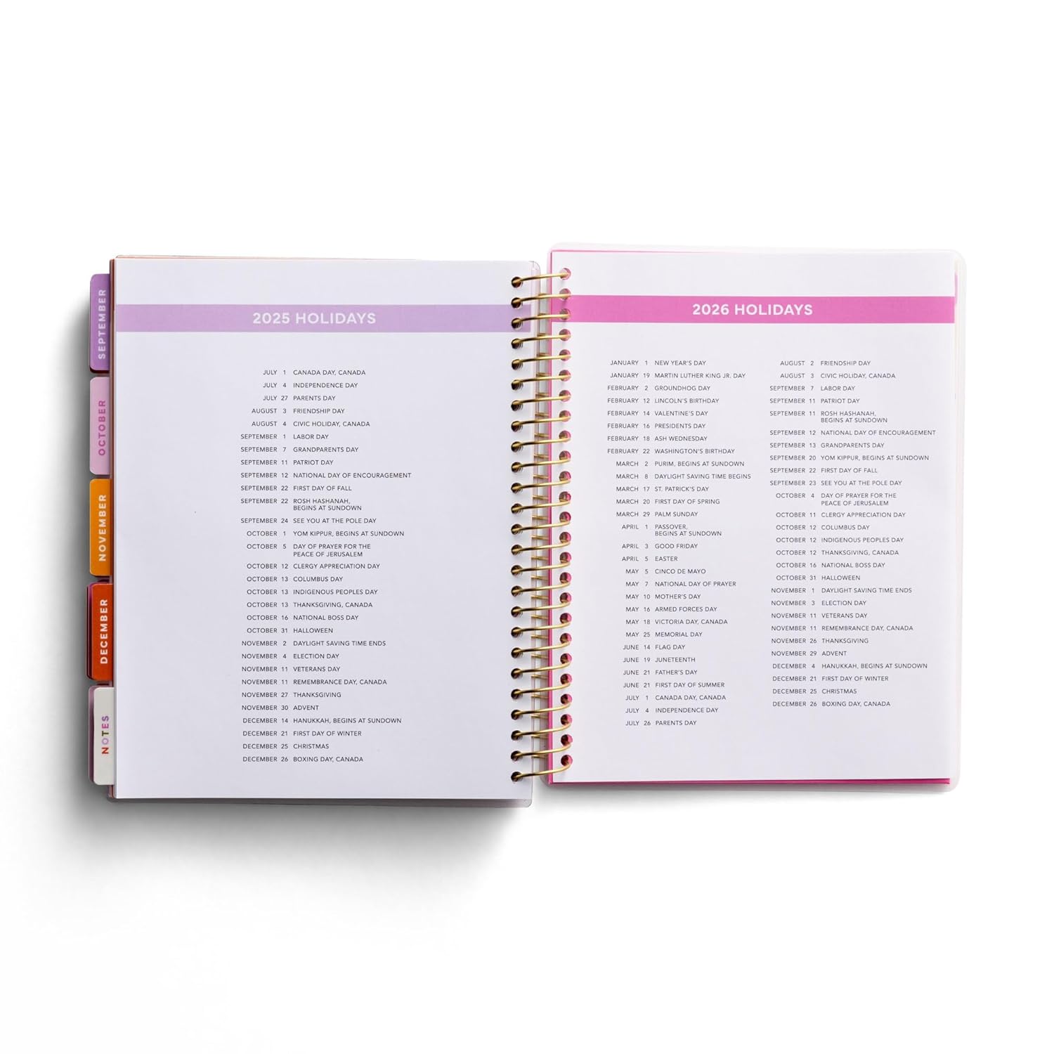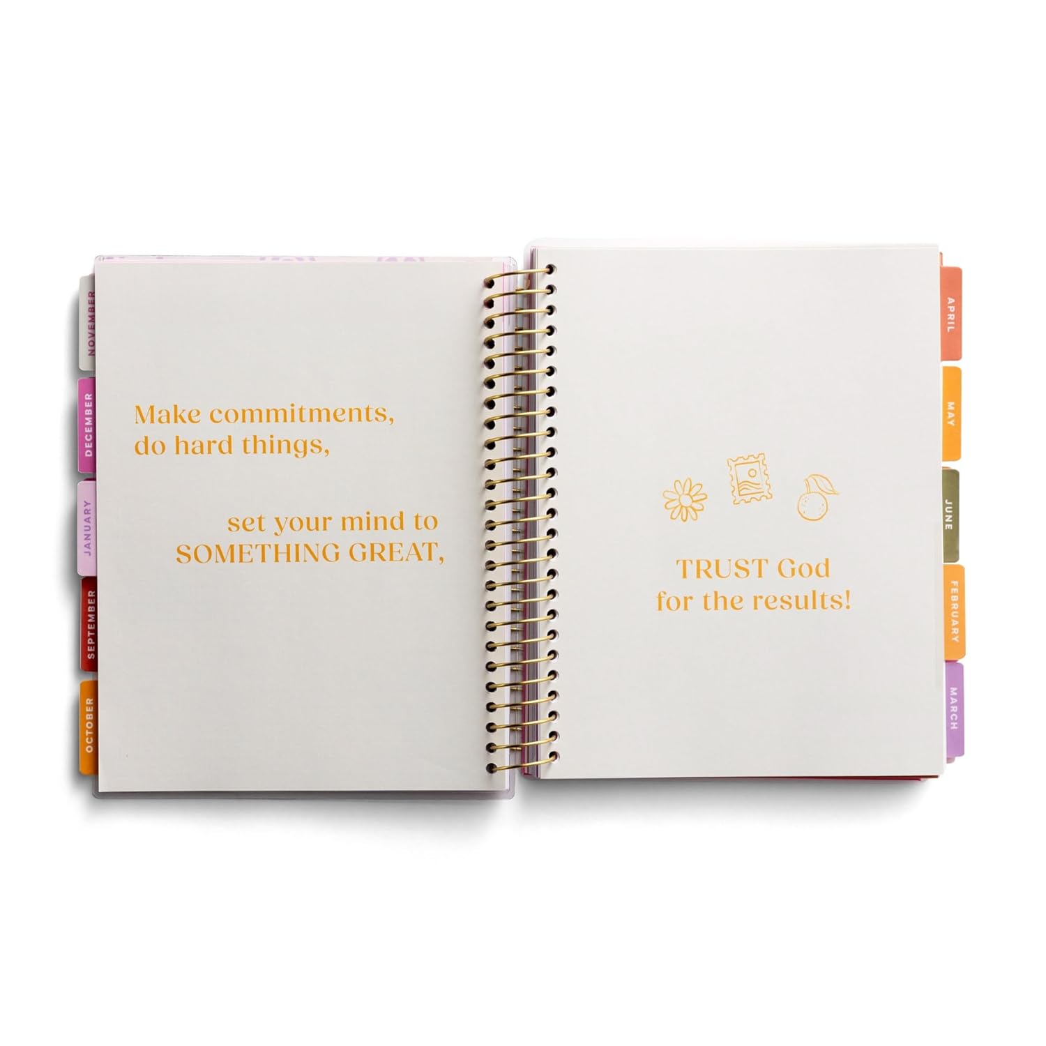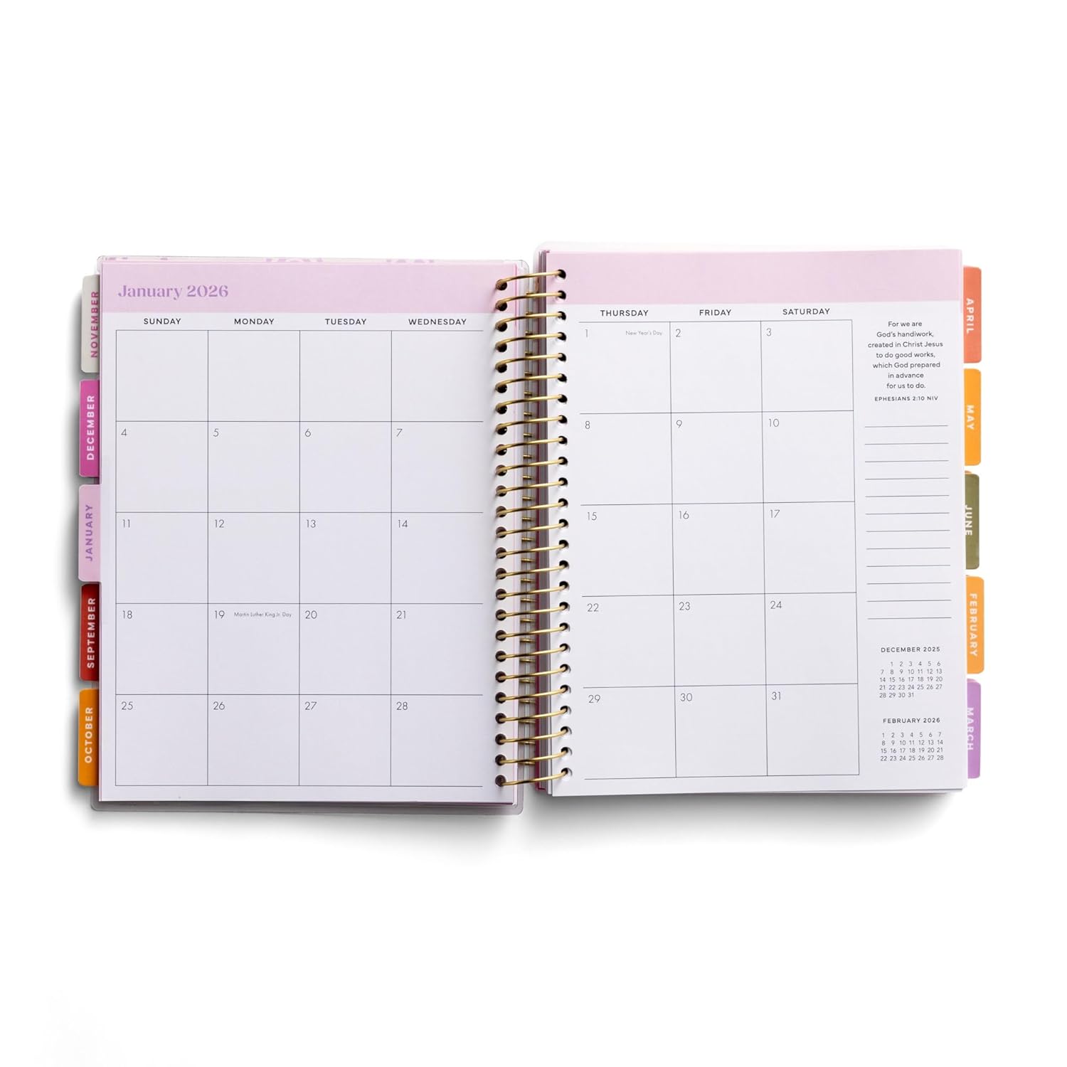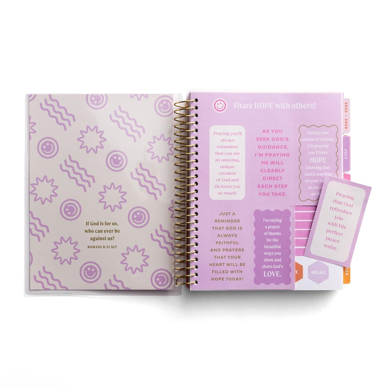 Stay organized and live your faith with Sadie Robertson Huff's new He is For You 18-month agenda planner from DaySpring. This planner features monthly spreads and weekly layouts for July 2025 - December 2026 with plenty of space for you to plan, track goals, and more. Featuring quotes from Sadie that encourage readers to partner MOVEMENT with FAITH. The quality laminated cover and tabs ensure durability, while the spiral bound and lay flat design offer convenience. An interior pocket page provides extra storage, and the planner also includes three colorful sticker pages and six perforated notes to share hope. This 18-month agenda planner is the ultimate companion to help you stay on track all year.