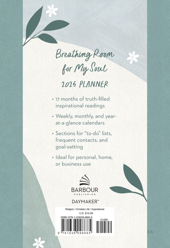 Ideal for personal, business, or school use, this Breathing Room for My Soul 17-month planner includes uplifting, truth-filled monthly devotional readings, plus faith-building scripture selections and devotional-like thoughts for every week of the year. Featuring monthly and weekly calendars, a year-at-a-glance section, pages for frequent contacts, and more, this planner offers an important reminder for your lovely heart: when the world feels like it's closing in, when the stresses of life threaten to stifle your contentment and steal your joy. . .there is one who offers breathing room for your soul—and His name is Jesus.