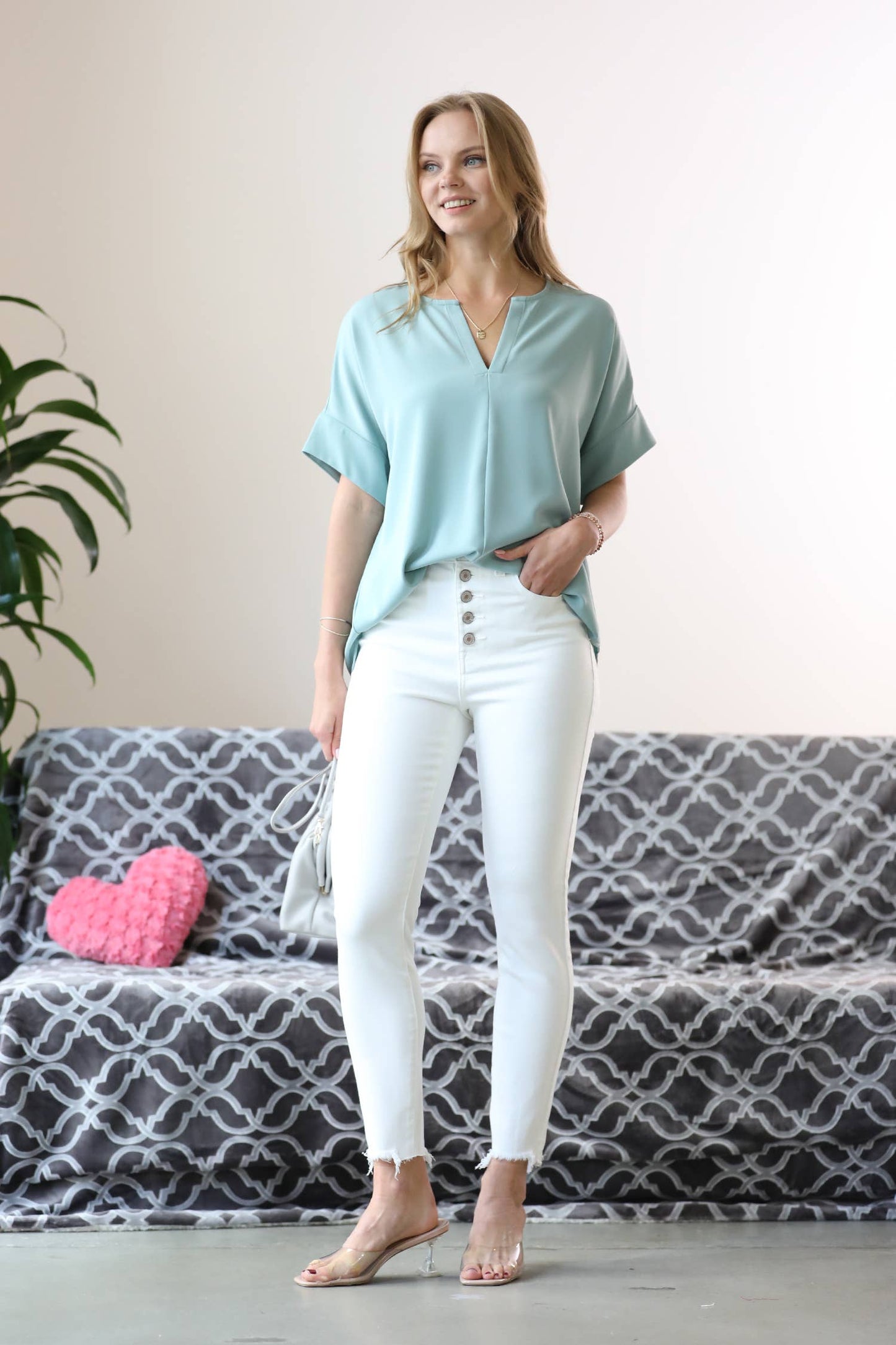 42POPS -Notch neck wide sleeve woven top
