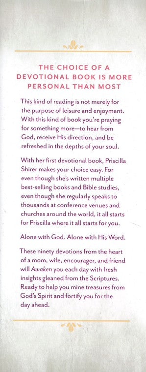 Return to the core of your relationship with God - spending time alone with Him with this 90-day devotional from Priscilla Shirer. Awaken: 90 Days with the God Who Speaks, will help you mine the treasures of Scripture and fortify you for the day ahead. Awaken each day with fresh insights gleaned from the Spirit of God that will challenge, encourage, and strengthen you