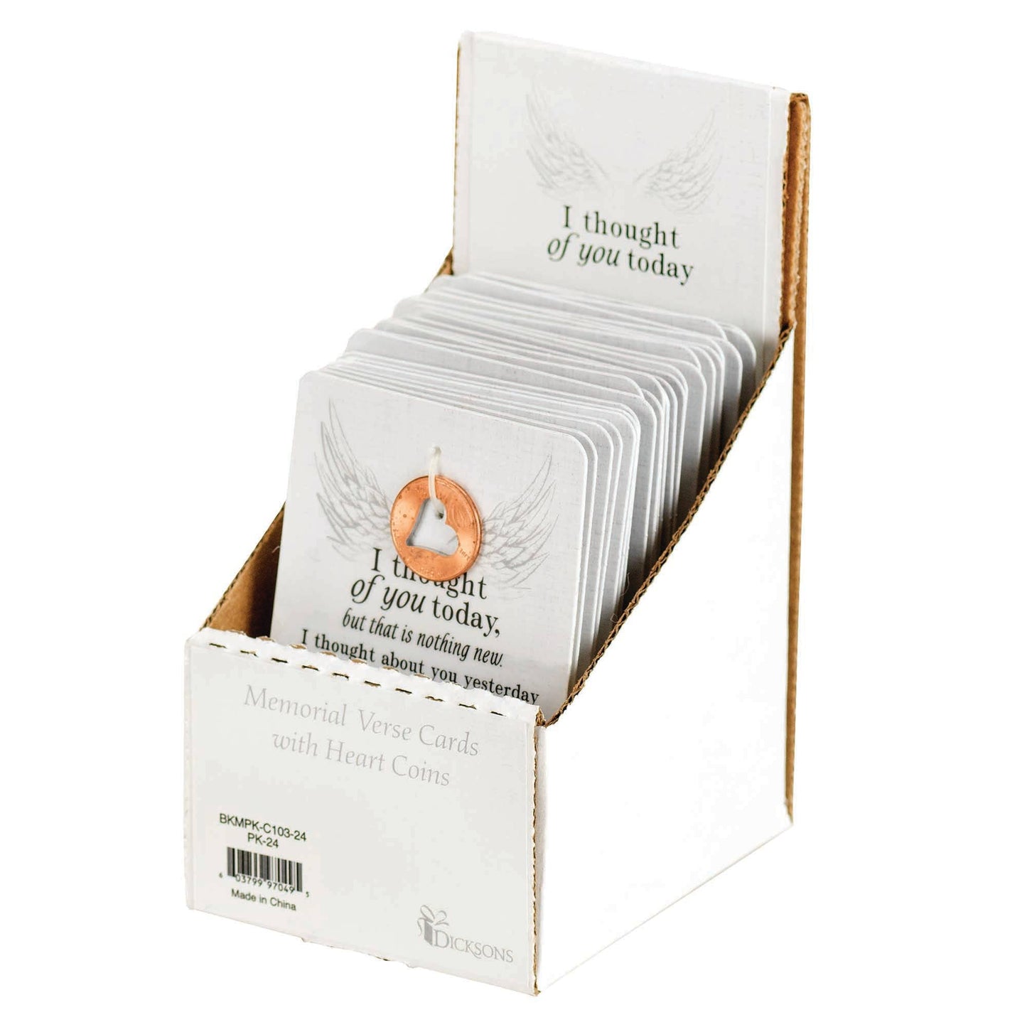 I thought of you today bereavement pocket card with heart penny, pack of 24 in display box perfect for funeral homes or large family groups, this pocket card style bookmark comes with attached genuine penny that has cutout heart shape. Makes a great memory coin to carry in pocket or purse. The bookmark card has lovely angel wing design and the poem I thought of you today. On back are to and from spaces for writing in names. Size is 2 1/2" x 3 7/8". Sold in pack of 24, in display style box. Text of poem: I thought of you today, but that is nothing new. I thought about you yesterday and days before that too. I think of you in silence, I often speak your name. All I have are memories and your picture in a frame. Your memory is a keepsake from which I'll never part. God has you in his arms, I have you in my heart.