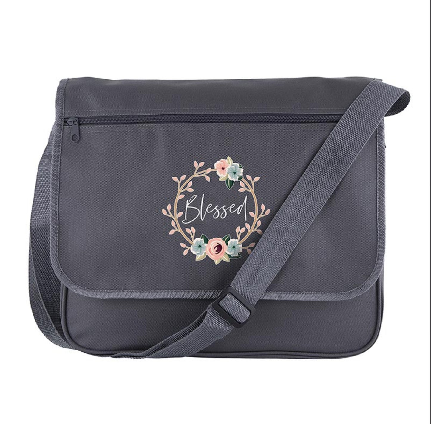 This messenger bag features a round flower motif surrounding a word "Blessed" on the flap and spacious compartments to fit Bible to notebooks.