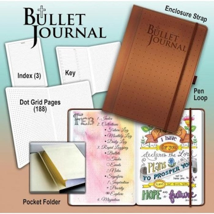 Bullet journal is a great way to track past, organize present, and plan for the future. Create your own symbols, charts, and color codes for events, tasks, and notes. Manage thoughts, goals, and actions on monthly, weekly, or daily basis. Features: Three index pages One key page 188 dot grid pages Expandable pocket folder on inside back cover Two bookmark ribbons Pen loop Elastic strap enclosure 5.75" x 8.25"