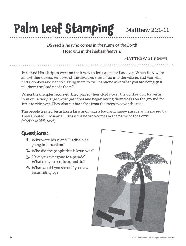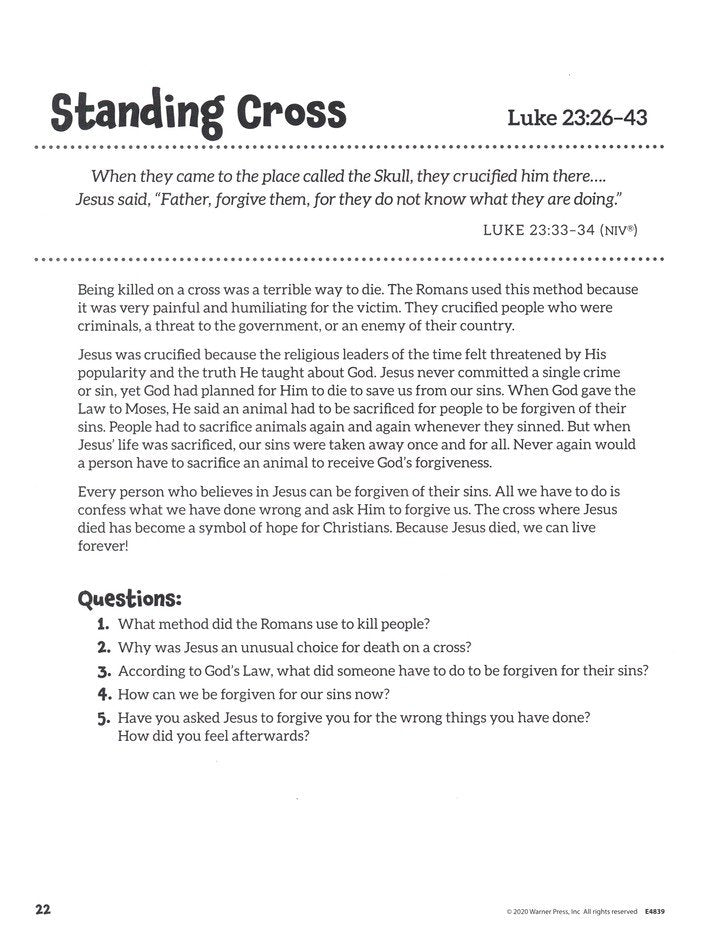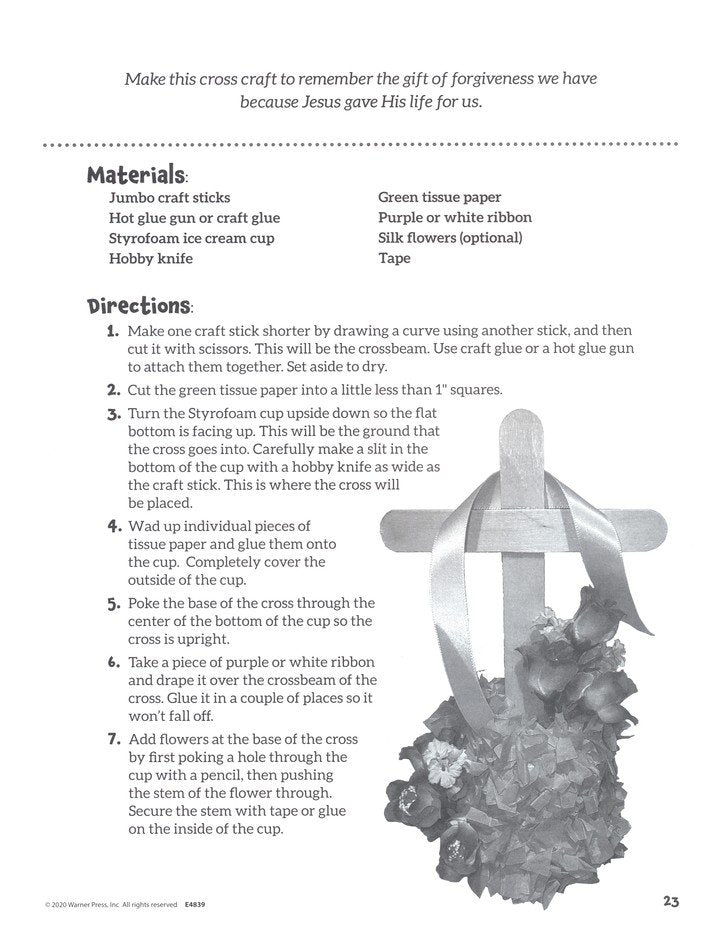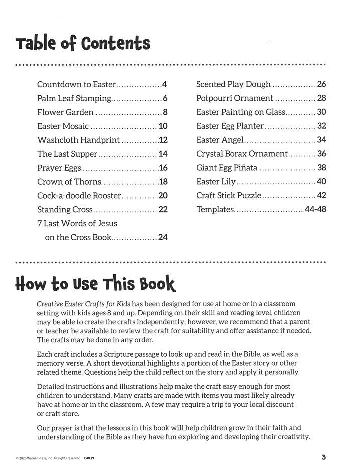 Creative Easter Crafts for Kids features 20 crafts related to the Bible story of Jesus' death and resurrection. Each activity includes a Scritprue reference, short story based on a Bible passage or themes, questions for children to answer, and a craft that reinforces the story. Great for teachers, Sunday Schools, or home use for families.