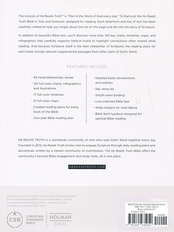 The He Reads Truth Bible features the highly readable, highly reliable text of the Christian Standard Bible. (CSB). The CSB stays as literal as possible to the Bible's original meaning without sacrificing clarity, making it easier to engage with Scripture's life-transforming message and to share it with others.