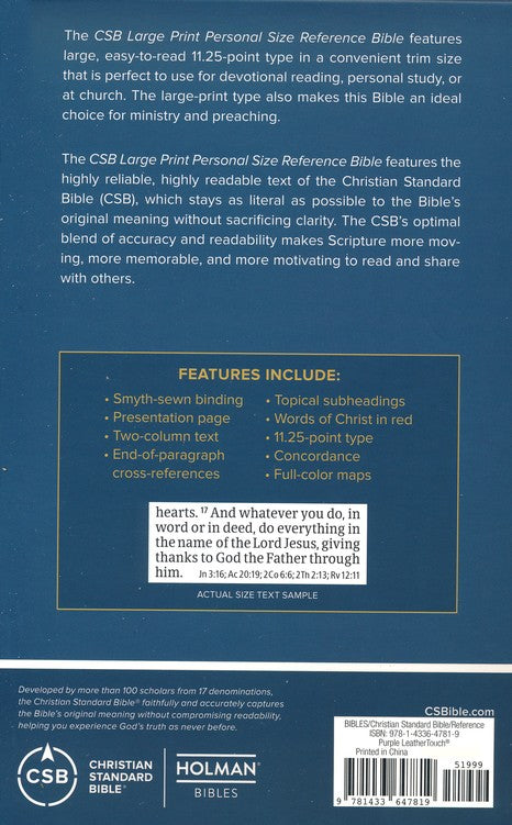 The CSB Large Print Personal Size Reference Bible features large, easy-to-read 11-point type in a convenient, easy-to-carry personal trim size that is perfect for devotional reading, personal study, or to carry and use at church.