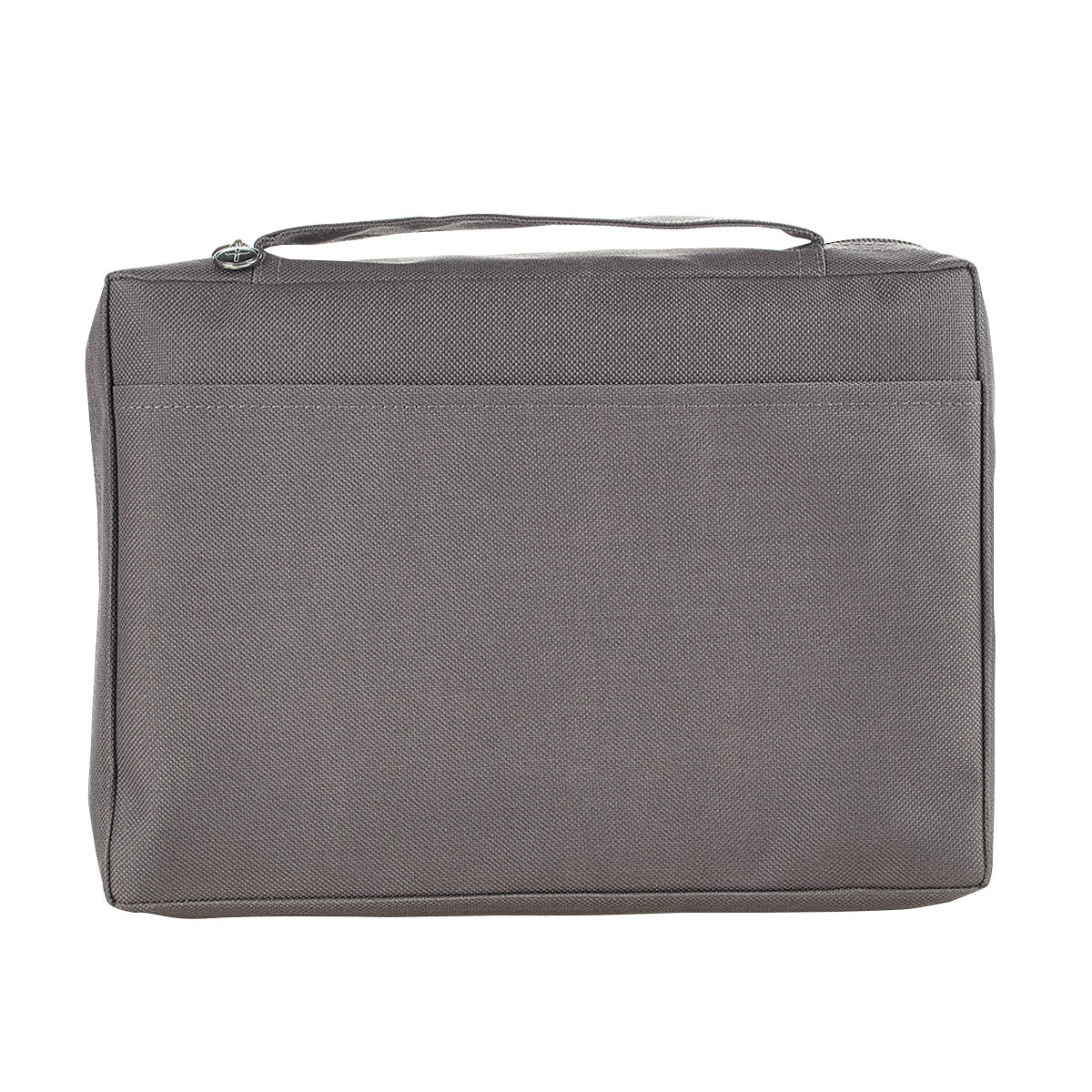 The back panel has a slip pocket. The sewn-in lay-flat spine handle ensures the Bible cover opens all the way and lays flat. Inside is a pen loop, and a cross engraved zipper pull securely closes the cover.