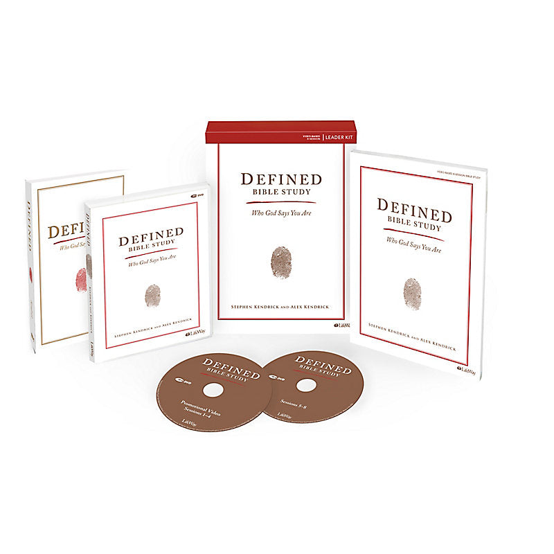 Defined Leader Kit includes a Bible Study Book, two DVDs with 18 to 26-minute video sessions, and the Defined trade book. The videos include a promotional segment and teaching sessions featuring authors Stephen and Alex Kendrick and other contributors. The Kit also includes codes for access to digital video downloads.