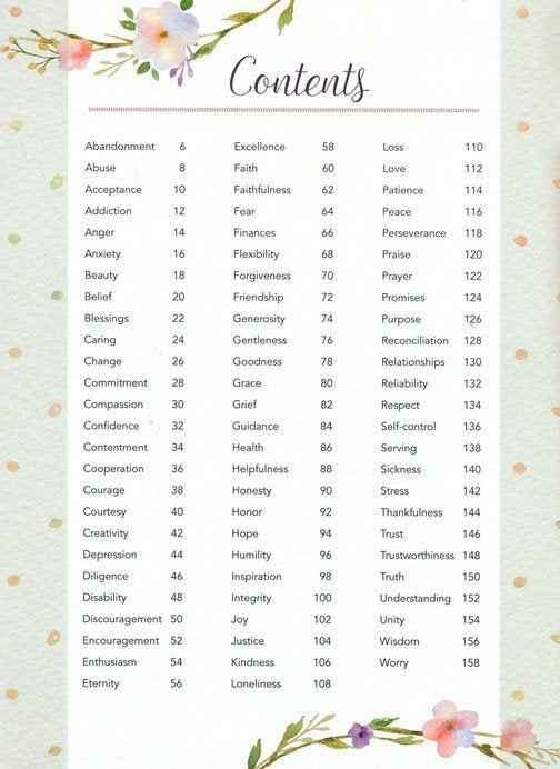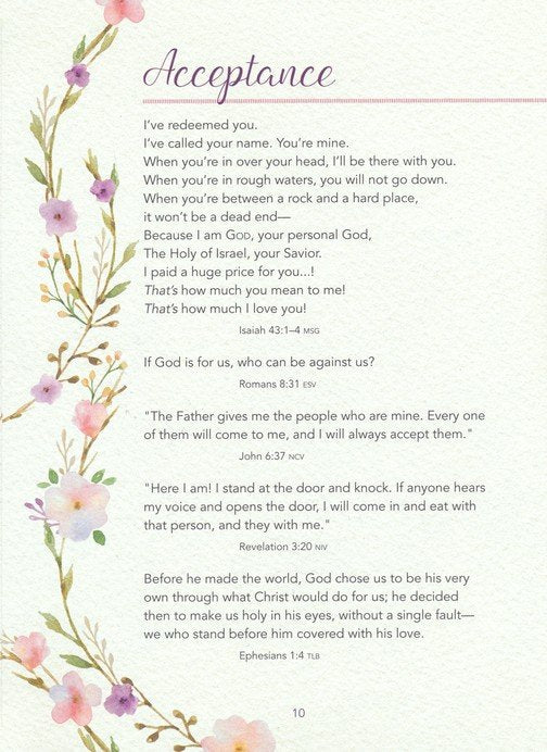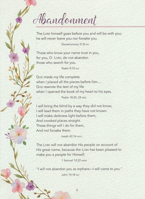 The pages of this Bible promise journal are designed to help you draw everything you need from God’s Word. The scriptures are topically arranged so you can find reassurance that is relevant and refreshing for each moment.