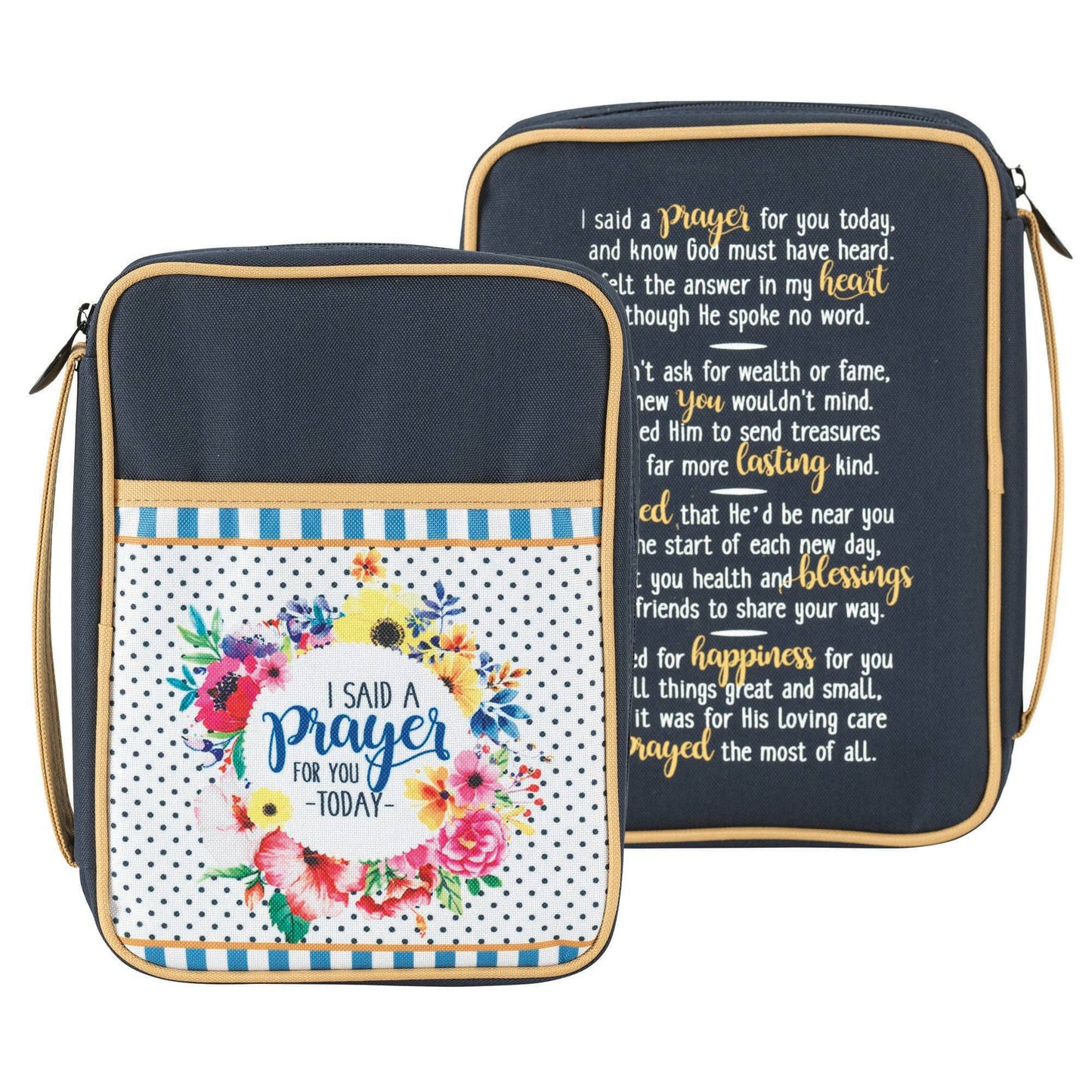 Special Buy! Hurry before it is gone! I said a prayer canvas bible cover thinline size. Floral and polka dot design make this cover a pleasure to use. Front pocket has I said a prayer for you today while the back of the cover has the entire poem. Spoon shaped zipper pull engraved with a cross. Side carrying handle. Thinline size fits a bible or book up to about 6 1/2" x 9 1/2" x 1 1/4". I said a Prayer for you today, and know God must have heard. I felt the answer in my heart although He spoke no word. I didn't ask for wealth o
