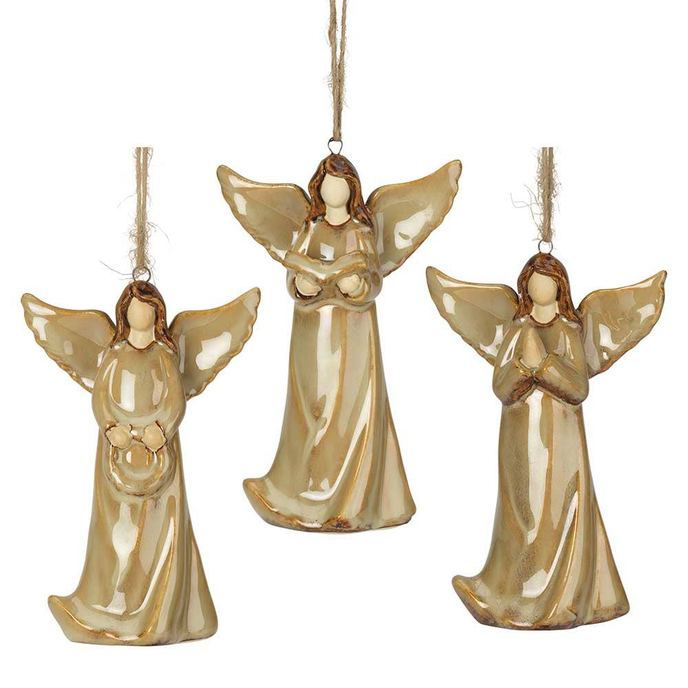 ASSORTED ANGEL ORNAMENTS. ONE WITH WREATH, ONE WITH BOOK, ONE WITH PRAYING HANDS. ALL ON A RIBBON HANGER. VIBRANT GOLD COLOR.