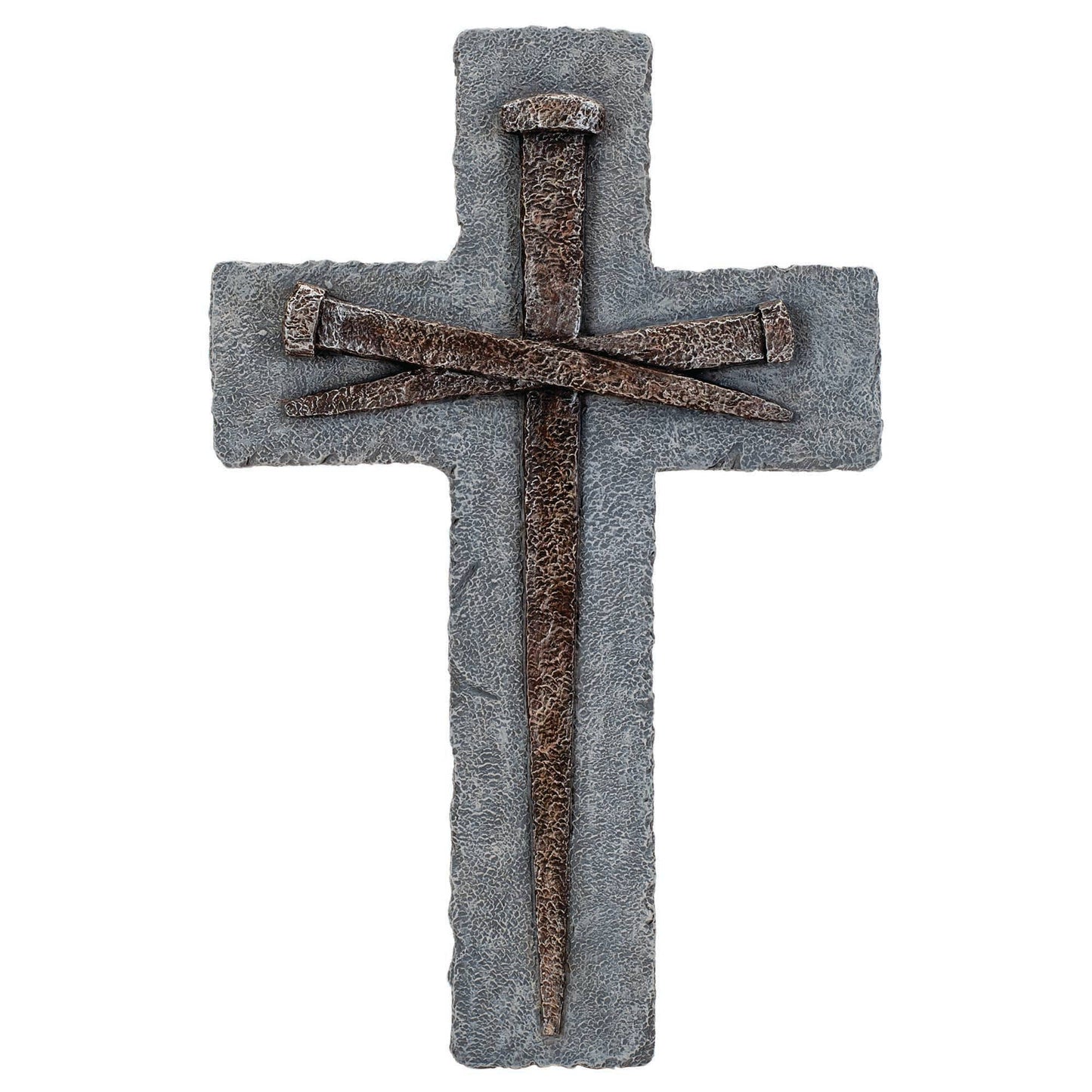 Nails on stone look easter wall cross with a rustic simplicity this cross quietly conveys the message of easter and the suffering that christ endured for us. Stone-textured cross has a light pewter tone and the weathered-textured nails have a bronze appearance. Height of cross is 10 3/4". Metal hanger on back.