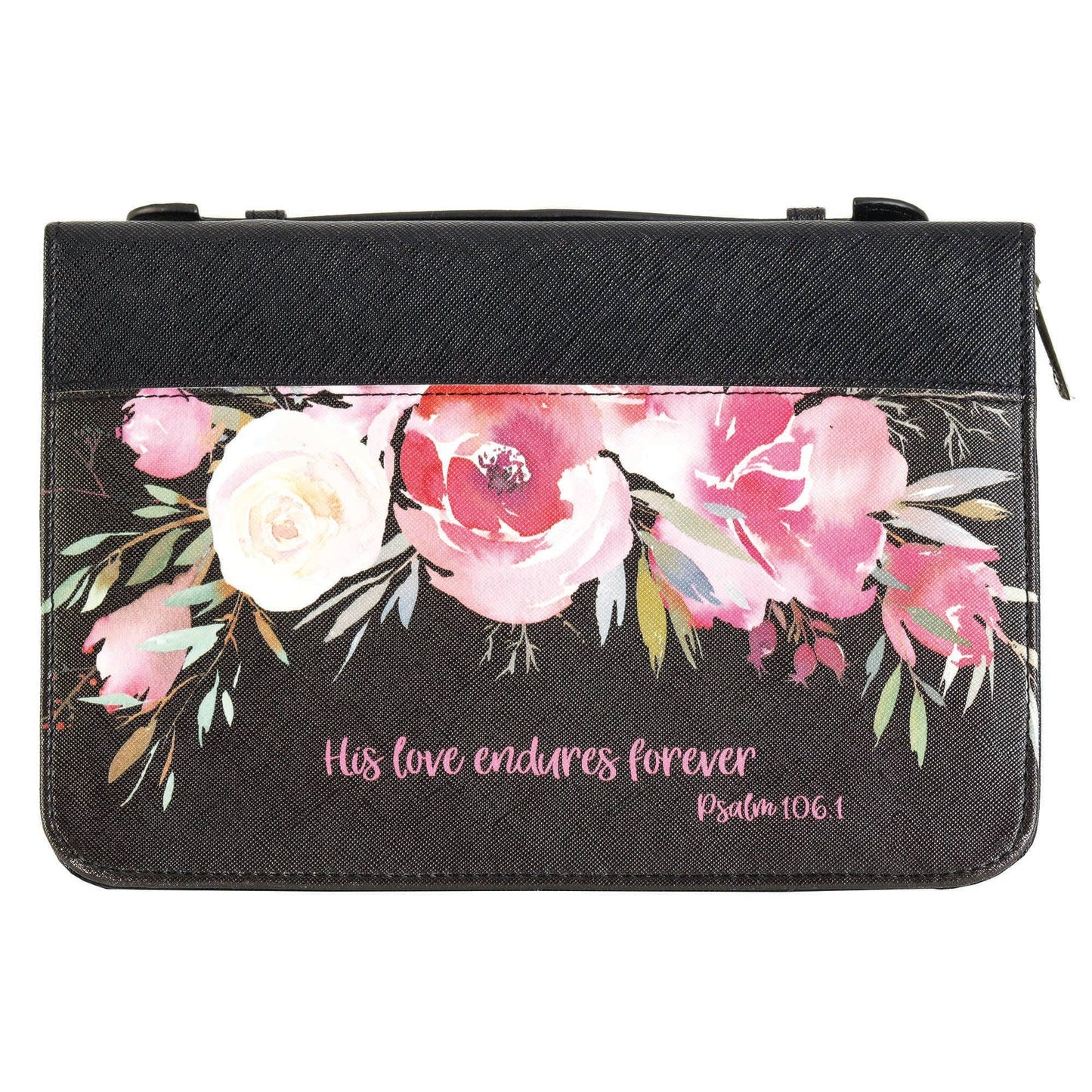 Bible cover with black-colored body and floral accents. Features Psalm 106:1: His love endures forever. Size XL.