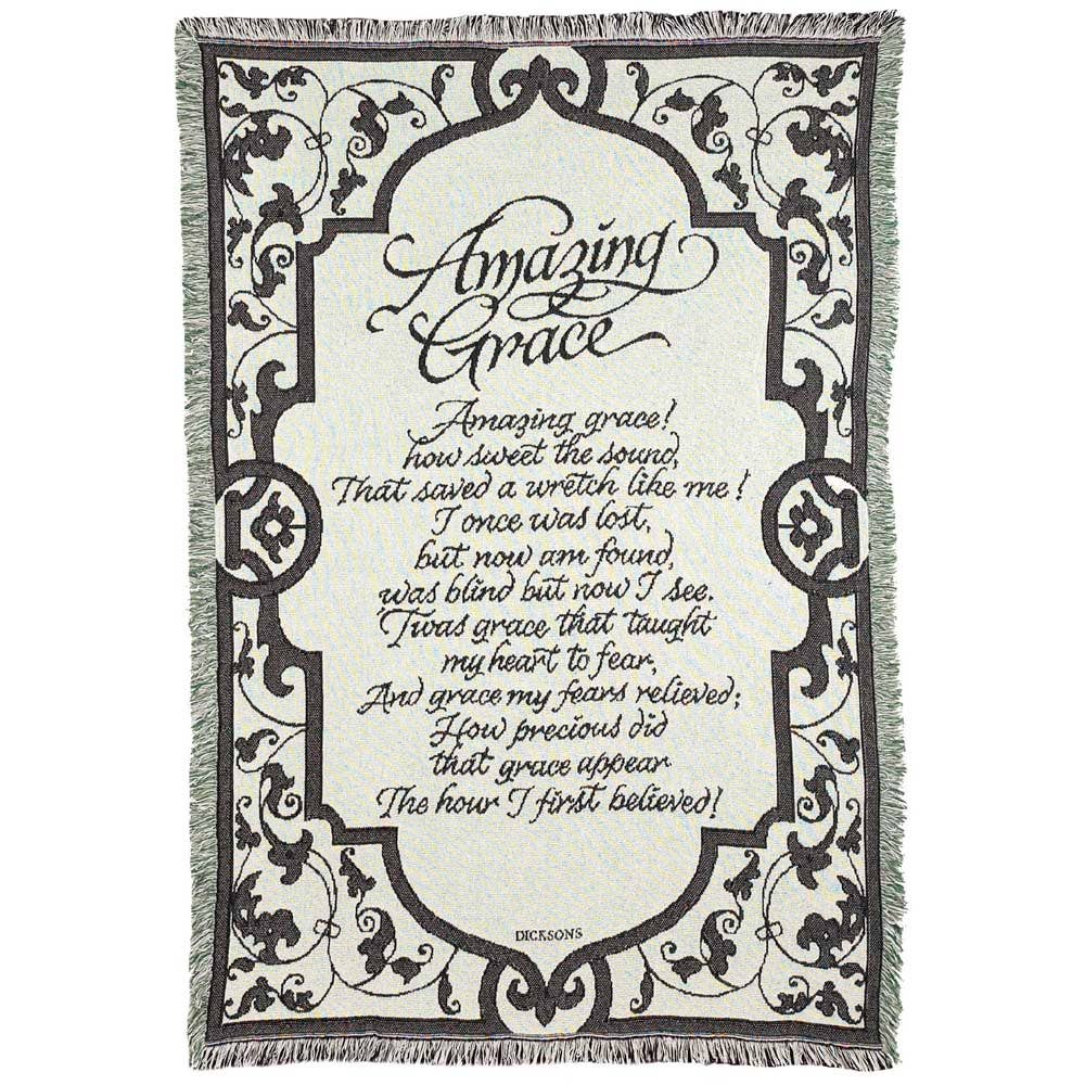 The well-loved first stanza of Amazing Grace is featured in elegant calligraphy with attractive border on this medium weight fringed throw. Soft green tones. Made of 100% cotton and measures a generous 46” x 68”.
