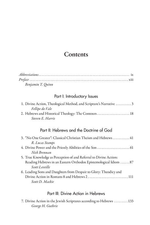Recent years have seen renewed interest in divine action, but much of the literature tends to focus on the science-theology discussion. Resulting from multi-year work of the Scripture and Doctrine Seminar, part of KLC's Scripture Collective, this book attends to the portrayal of divine action in one major biblical text, namely Hebrews. In the New Testament, Hebrews is on par with Romans in terms of importance but has too often been overlooked. Contributors to this volume explore the many different ways in which divine action is foregrounded and portrayed in Hebrews. As its name indicates, Hebrews overflows with Old Testament intertextuality, which also makes it a fertile ground for analysis of divine action stretching back into the Old Testament and opening out into different parts of the NT. The essays in this volume: