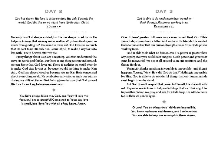 Every day for an entire year, the boys in your life will be encouraged, challenged, and inspired by great passages of scripture addressing themes of God, Jesus, heaven, love, miracles, wisdom, and much, much more. Each devotional reading will meet them right where they are--offering words of comfort, peace, and hope for everyday life. This daily devotional is a great tool to help kids build a strong foundation of faith!