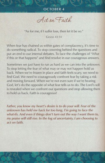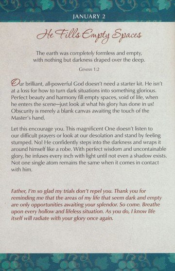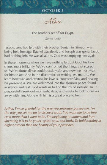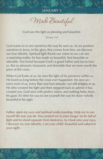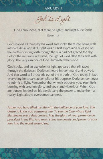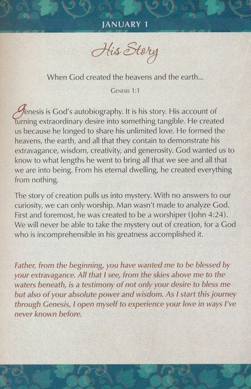 Unveil creation's mysteries and the foundation for all divine revelation as you explore the Book of Genesis. In 365 daily devotions, Simmons and Rodriguez offer Scripture verses and prayers that will bring you to your knees in worship and inspire you to share God's redemptive heart with the world. 384 pages, dark green imitation leather from Broadstreet.