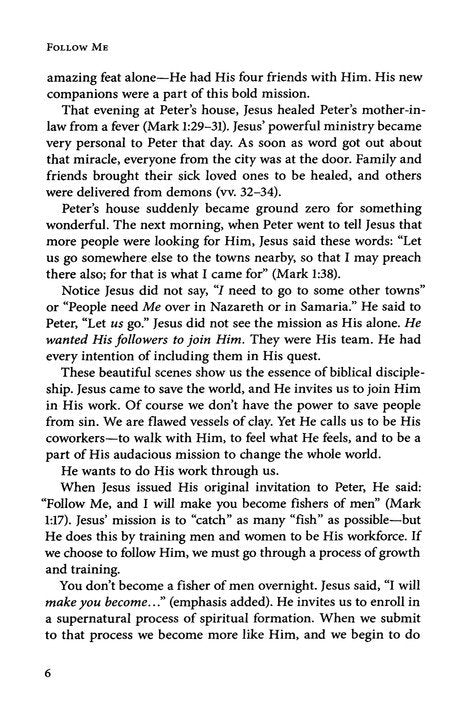 Follow Me will teach you how to effectively mentor the next generation of Christians. You will learn how to disciple others in their faith while getting outside of your comfort zone to increase your relationship with God.