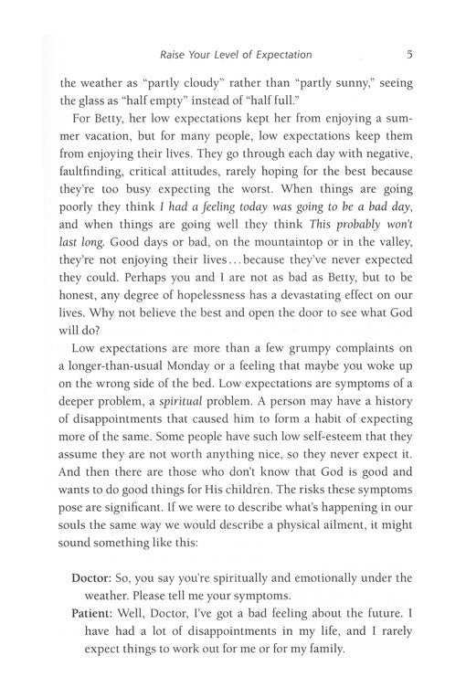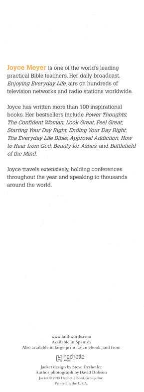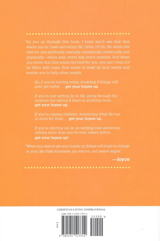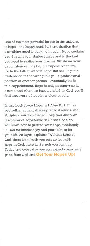 In Joyce Meyer's new book, Get Your Hopes Up, she confesses her own struggle with hopelessness and reveals how to harness hope and reap its rewards. Hope is a belief that something good is about to happen at any moment! She provides readers with three practical steps to embrace hopefulness in their lives: Believing, Asking, and Looking. In the book, Meyer gives multiple examples of God's people seizing supernatural opportunities despite their limited abilities and encourages you to discover the life-altering power of hope, whatever the challenges are that you are facing today.