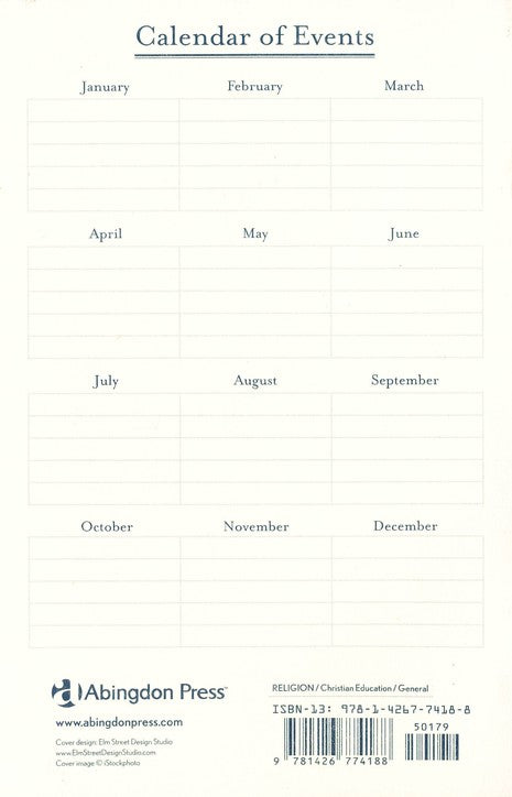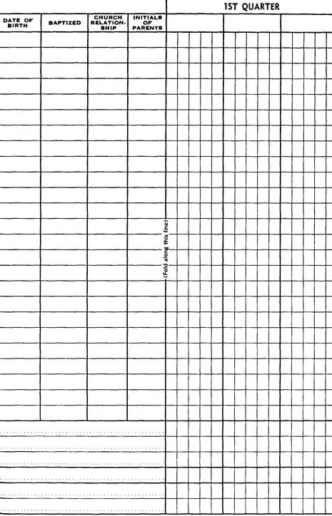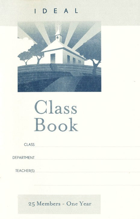 Record Sunday school class attendance for a full year including name, address, telephone, birthday, and church relationship. Space for 25 names for four quarters and additional class sessions, plus notes and a calendar of events. Size is 5.5" x 8.5"