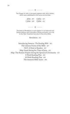 The Immerse series of Bibles takes humanity's bestselling and most influential story -God's Word- and delivers it to you as it was read by its very first audience - without chapter and verse. Presented in the New Living Translation, God's story comes alive with the translations well received vibrant vocabulary and modern grammar, while paying close attention to the original biblical languages. The text is presented to contemporary believers in a contemporary format; uninterrupted by references of chapter and verse, the story of God's special revelation is displayed in a familiar format to modern readers but at the same time is presented similarly to those that read the very first written portions of what we know of as the Scriptures.