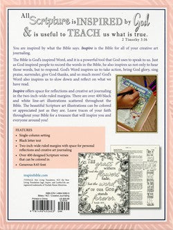 Inspire is a single-column, wide-margin New Living Translation Bible that will be a cherished resource for coloring and creative art journaling. It’s the first Bible of its kind—with over 400 beautiful line-art illustrations spread throughout the Bible. Full-page and partial-page Scripture art is attractively displayed throughout the Bible, and the illustrations can be colored in to make each Bible unique, colorful, and customizable. Every page of Scripture has two-inch-wide margins, with either Scripture line-art or ruled space for writing notes and reflections, or to draw and create. The generous 8.65-point font ensures optimal readability, and quality cream Bible paper is great for creative art journaling. Inspire is available in the popular New Living Translation, and is designed uniquely to appeal to art-journaling and adult coloring book enthusiasts.