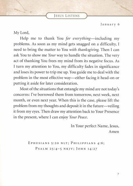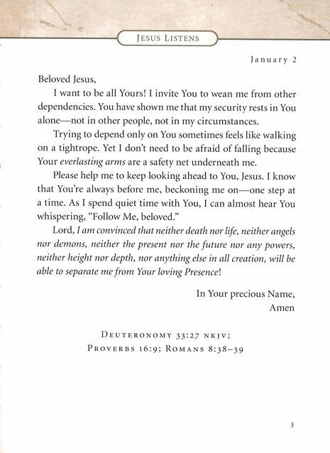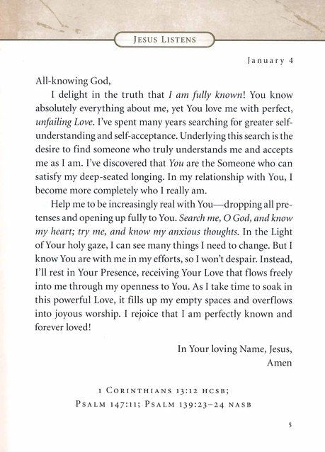 The biblical basis for each prayer in Jesus Listens is given at the end of each entry so you can continually return to God's promises in Scripture. Jesus Listens includes: