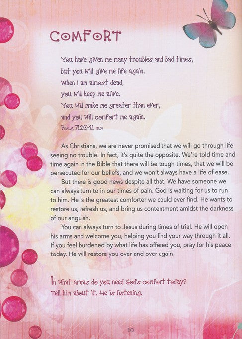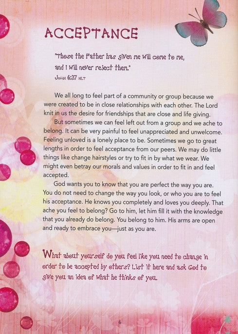 Pretty devotional journal for girls with debossed cover design and elastic band closure. Designed for girls of every age, covering topics of courage, dignity, identity, beauty, value, and more. Each devotional is paired with Scripture and is accompanied by a lined journaling pages for your responses and thoughts. 6" x 8".