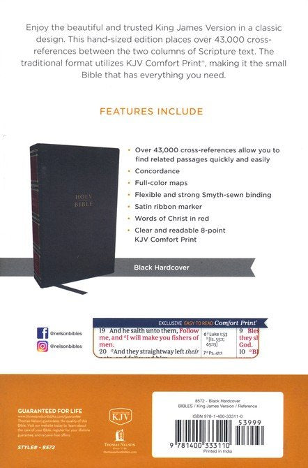 This KJV Bible places the unity of God's Word as its highest priority, placing over 43,000 cross references in the center of the page so you can easily see how all of the biblical stories tie together into a single, harmonious story of God's redemptive work. The profile of this Bible is compact and easy to carry, while the text has been printed with Thomas Nelson's Comfort Print typeface - a font that was exhaustively researched to be as pleasant to the eye as possible so you can remain in the Scriptures as long as you'd like.