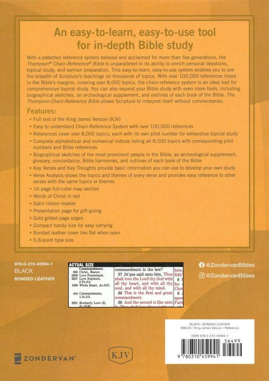 The KJV Thompson Chain-Reference Bible compels you to experience the harmony of God's Word with an optimal cross-reference system that has been enriching the spiritual hearts and minds of believers for over 100 years!