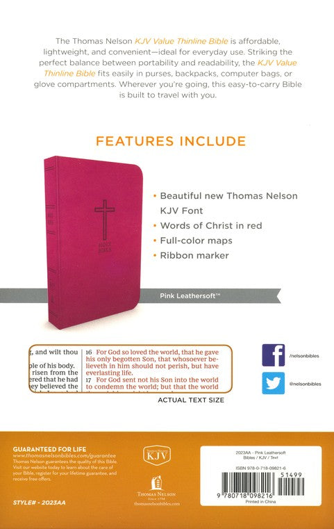 The Thomas Nelson KJV Value Thinline Bible, featuring the timeless beauty of the trustworthy King James translation, is affordable, lightweight, and convenient—ideal for everyday use. Striking the perfect balance between portability and readability, the KJV Value Thinline Bible fits easily in purses, backpacks, or glove compartments. Wherever you’re going, the KJV Value Thinline Bible is built to travel with you. This easy-to-carry Bible comes with features that will enhance your reading experience, including beautifully-designed covers, an all-new typesetting in the elegant and readable Thomas Nelson KJV font, a ribbon marker, and the words of Christ in red.