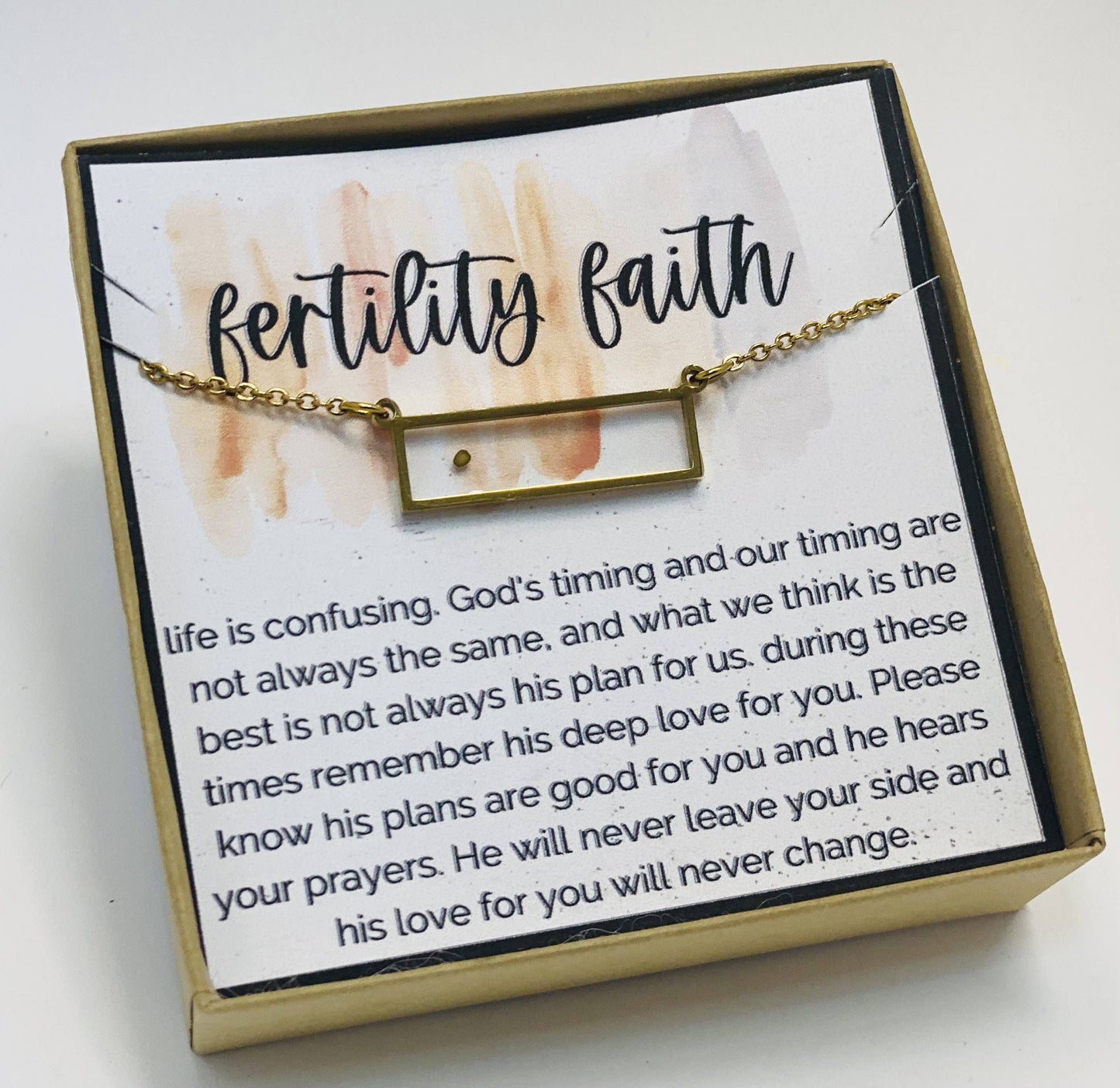 Fertility Wish Trying to conceive isn’t always easy. Sometimes you don’t know what to say when someone you love is hurting. This necklace is has a real mustard seed. It is meant to remind you that you are not alone. God is with you always. Please don’t lose the faith. You only need a little. God will do the rest.