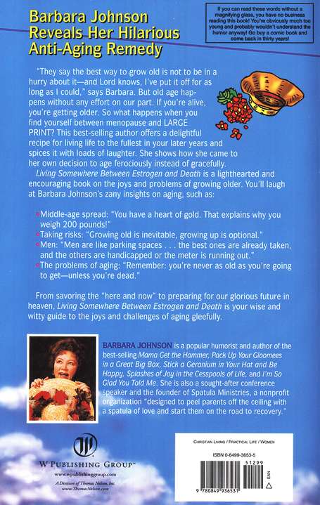 For Women Only. Barbara Johnson reveals her hilarious anti-aging remedies in this lighthearted and encouraging book on the joys and concerns of growing older. From savoring the "here and now" to preparing for our glorious future in heaven, Living Somewhere Between Estrogen and Heaven is your wise and witty guide to the joys and challenges of aging gleefully. Paperback