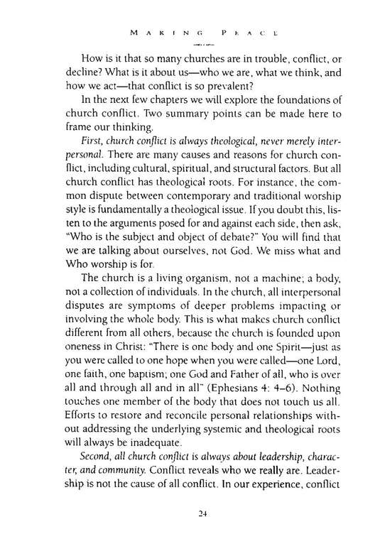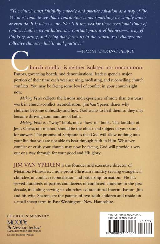 Conflict abounds in the church of Jesus Christ. Reconciliation within the body, however, will not happen with the right "method" or "set of principles." In Making Peace, readers are challenged to place their church and all of its dissension under the Lordship of Jesus Christ. Making Peace is a "why" book, not a "how-to" book. The lordship of Jesus Christ, not method, should be the object and subject of your search for answers. The promise of Scripture is that God will allow nothing into your life that you are not able to bear through faith in Him. Whatever conflict or crisis your church may now be facing, God will provide a way out or a way through for your good and His glory.