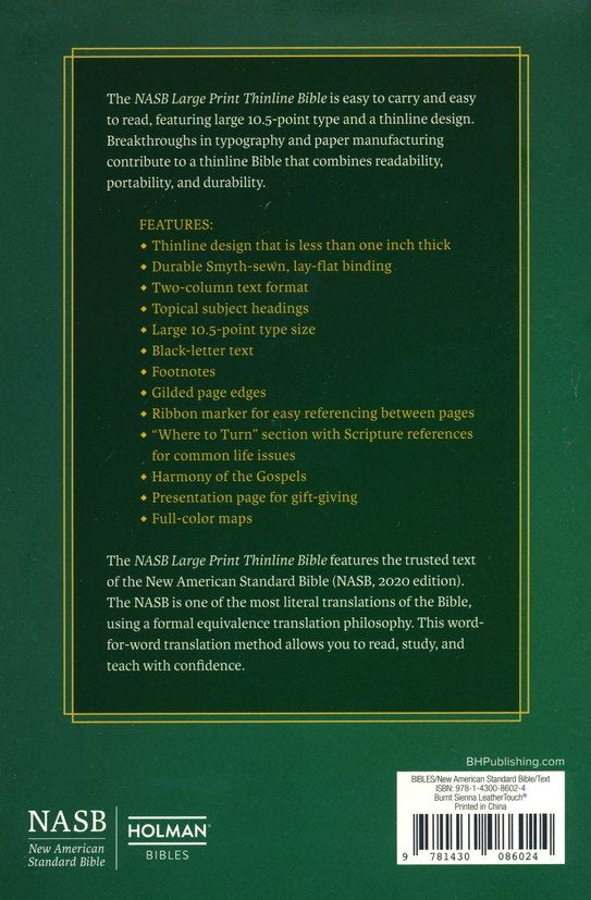 The NASB Large Print Thinline Bible delivers the acclaimed word-for-word translation of God's Word in an easily readable font size and an elegantly slim book profile.