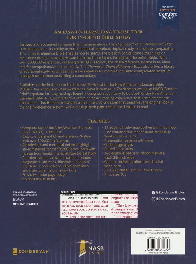 The NASB Thompson Chain-Reference Bible compels you to experience the harmony of God's Word with an optimal cross-reference system that has been enriching the spiritual hearts and minds of believers for over 100 years!
