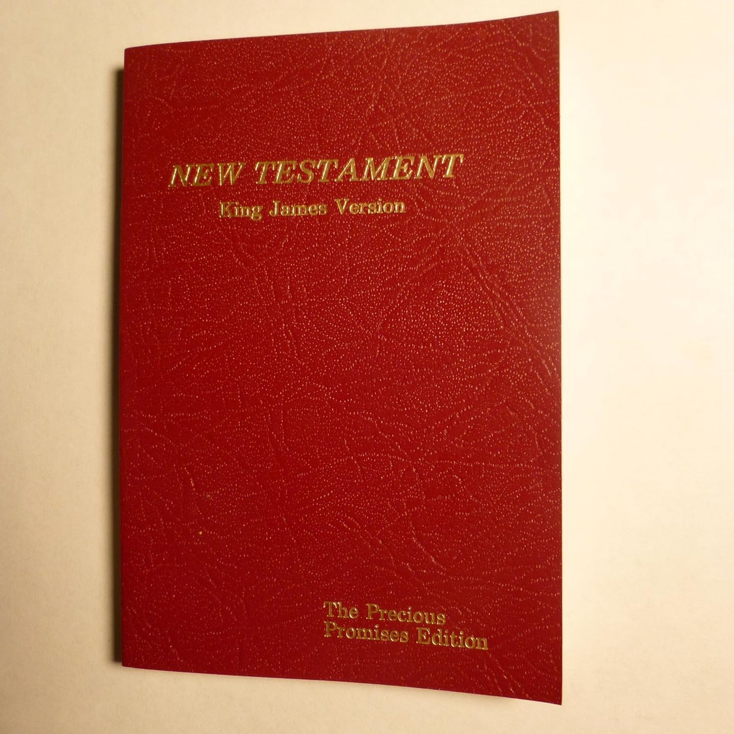 A fun little Bible to have. Promises are color coded, but the highlighting used is easy to read. Print is quite small though. Flexi little NT which is made to feel like leather- but is paper. This used New Testament rates fine but not brand new. Has no wear, no markings but has very minor creasing from reading. Then we send you a confirmation e-mail. We appreciate your business and welcome any questions. Paperback books differ greatly in construction, some are made with acid free paper, some with binding that becomes fragile after a few years, you should be familiar with the construction of your book by asking questions before purchasing or doing research